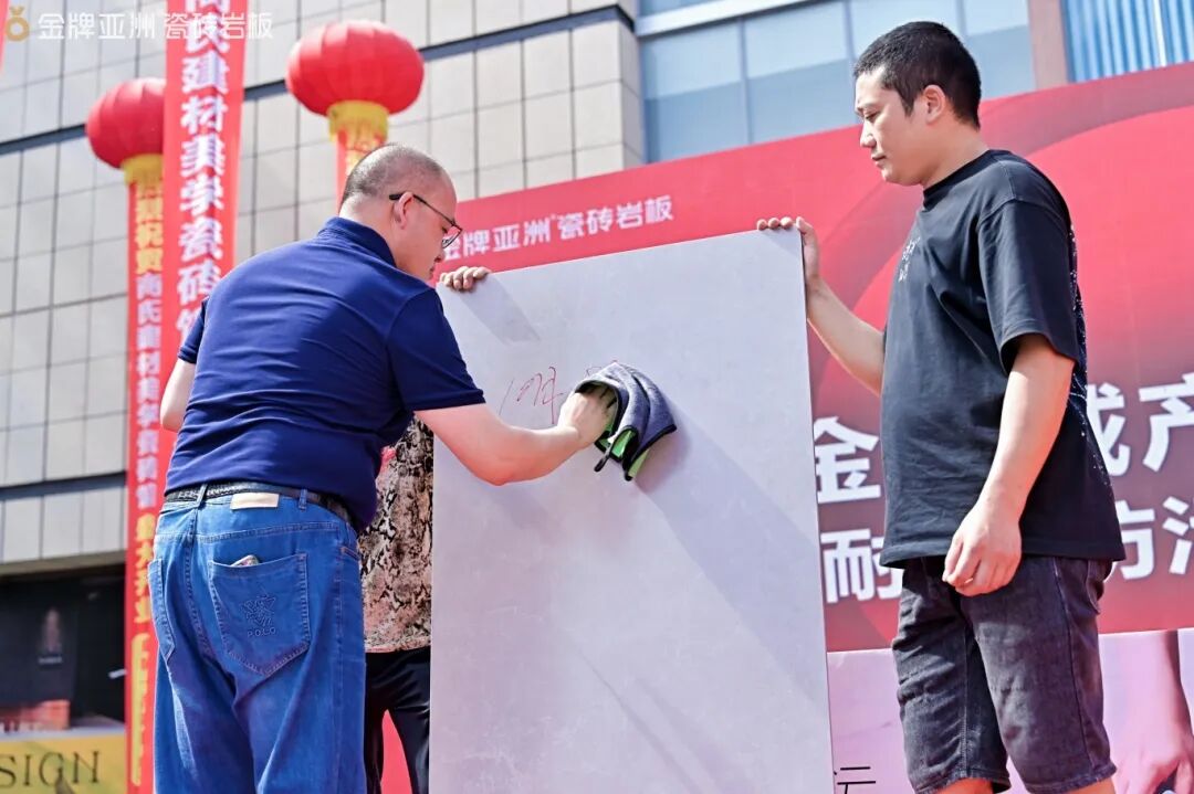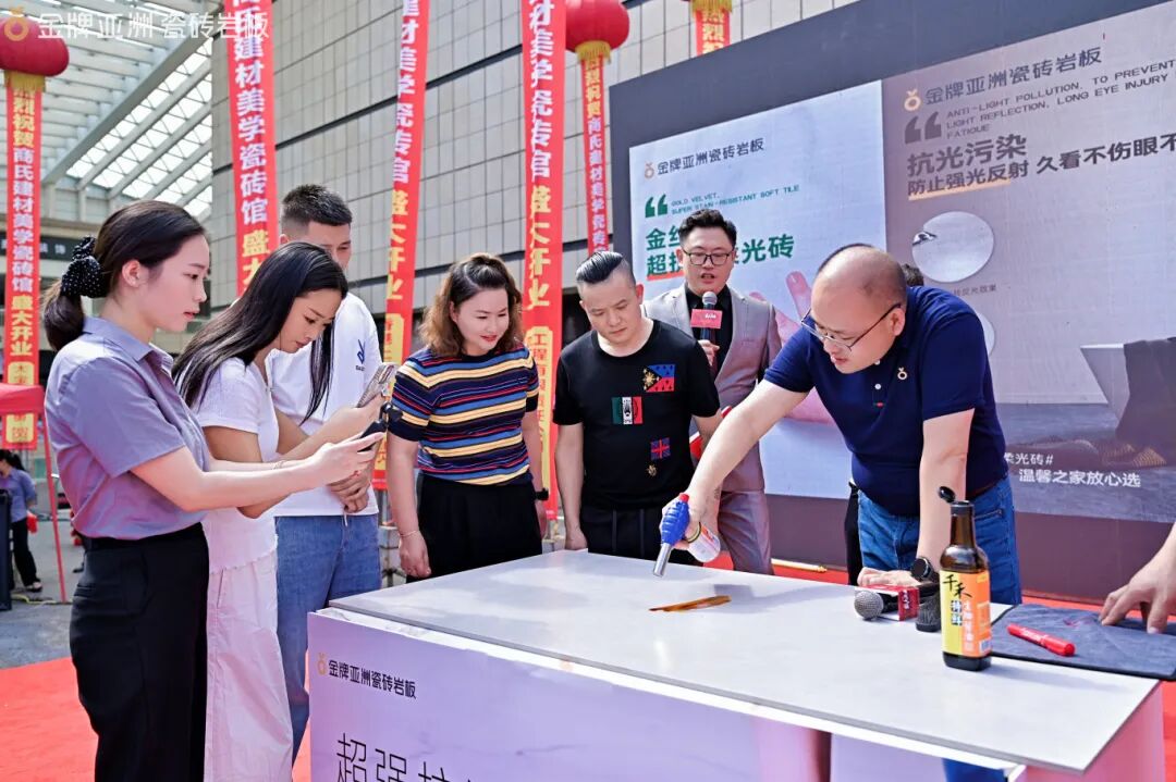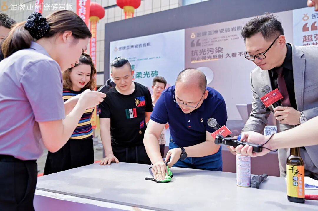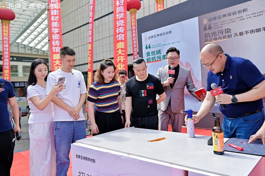 高档装修就选金牌亚洲。开业盛典上金牌亚洲营销中心营销三区业务经理聂保新为在场的嘉宾们深入介绍金牌亚洲品牌发展历程以及产品优势,并带领一众嘉宾上台进行金丝绒超抗污测试,近距离感受金牌亚洲金丝绒优越的超抗污性能。