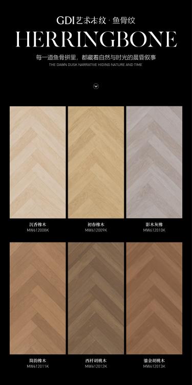 GDI鱼骨纹系列产品采用经典的鱼骨拼花设计,通过严谨的人字脉络延伸,营造出空间视觉的纵深感与流动感。沉香橡木如春日晨雾般轻柔自然;初春橡木展现新枝破土的清澈希望;影木灰橡以本真灰度描绘静谧画卷;简韵橡木诠释北欧澄澈美学;西杆胡桃木彰显温厚诗稿般的精致;鎏金胡桃木则流淌着日暮金的贵族气质。