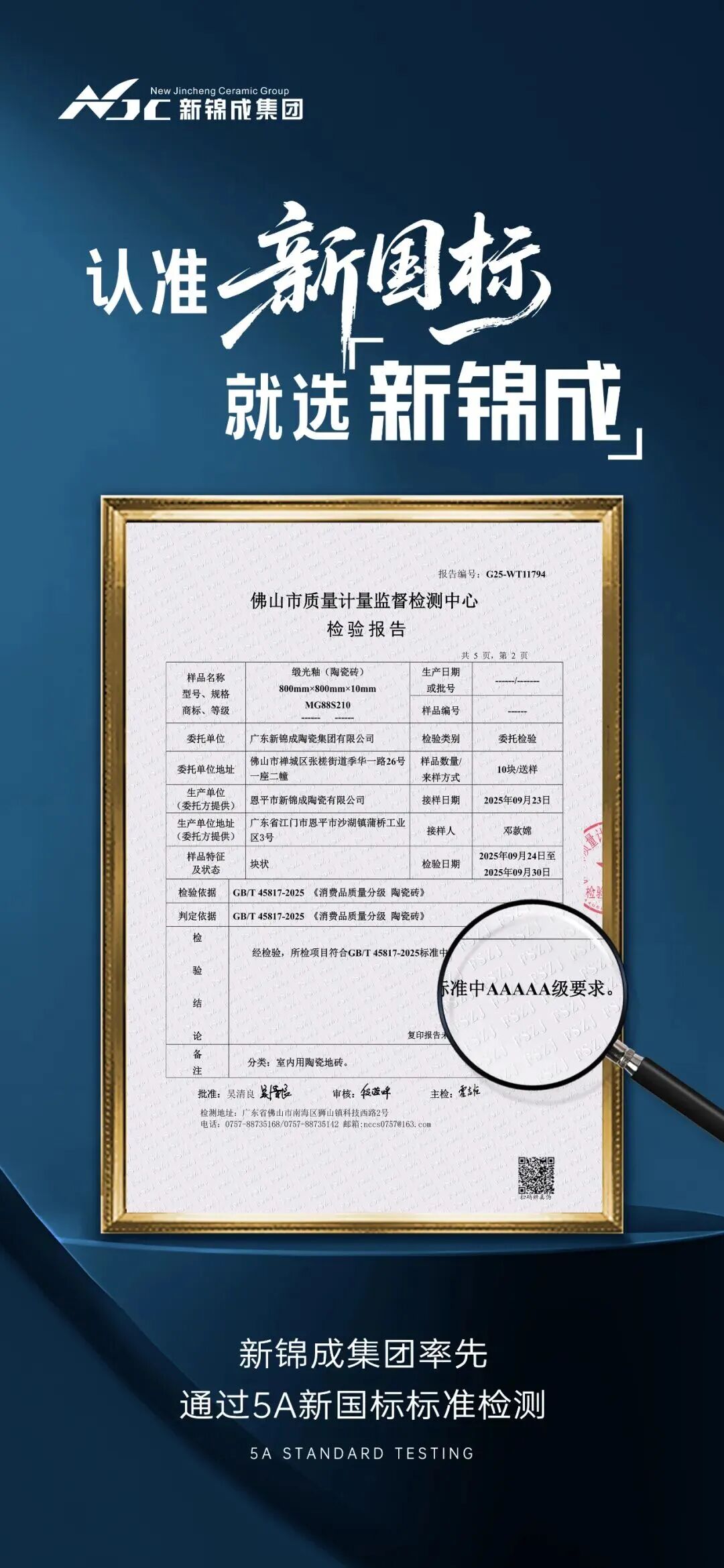 当多数陶企仍在研究标准文本、核算改造成本时,新锦成集团已悄然完成了一场覆盖全产业链的品质升级。经权威机构检测,其首批送检产品全面达到甚至超越5A级瓷砖标准。