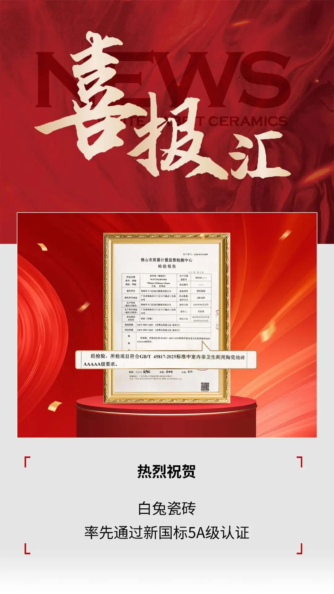 在新国标全面落地的行业浪潮中,白兔瓷砖以5A认证为新起点,将继续以匠心守初心,以技术创新深度践行新国标要求,更以高标准、新技术、优服务投身市场竞争,通过从产品达标到标准制定的全方位领先,用实际行动全力推动和引领中国建陶产业高质量发展。