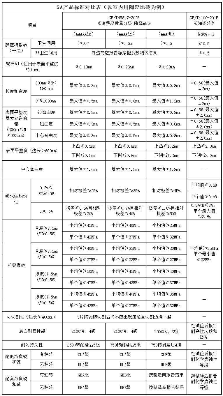 此次实施的陶瓷砖新国标堪称“史上最严”,建立 3A、4A、5A 等级体系,实现品质可视化,为消费者选购提供明确依据。其中 5A 等级对标国际领先水平,在吸水率、防滑性、耐污持久度、抗化学腐蚀等关键指标上设定严苛标准,成为高端瓷砖的核心评判标尺。