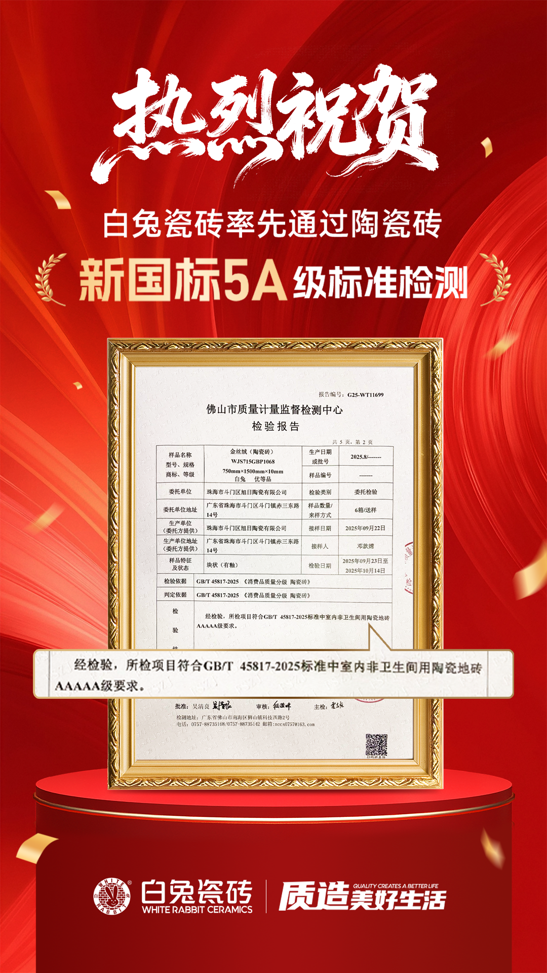 此次新国标 5A 落地,将彻底改变以往行业标准不一的混乱局面,标志着陶瓷行业正式建立起科学、规范的质量分级体系。行业也将从无序的低价竞争转向品质竞争赛道转型,是行业高质量健康发展的重要里程碑事件。白兔瓷砖也将以开放姿态分享经验,联合行业上下游、协会与科研机构对标升级,持续深化“三砖融和”战略,探索品类创新与场景应用,让更多消费者享受到高品质的美好家居生活。