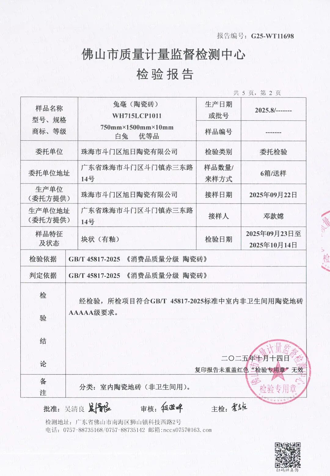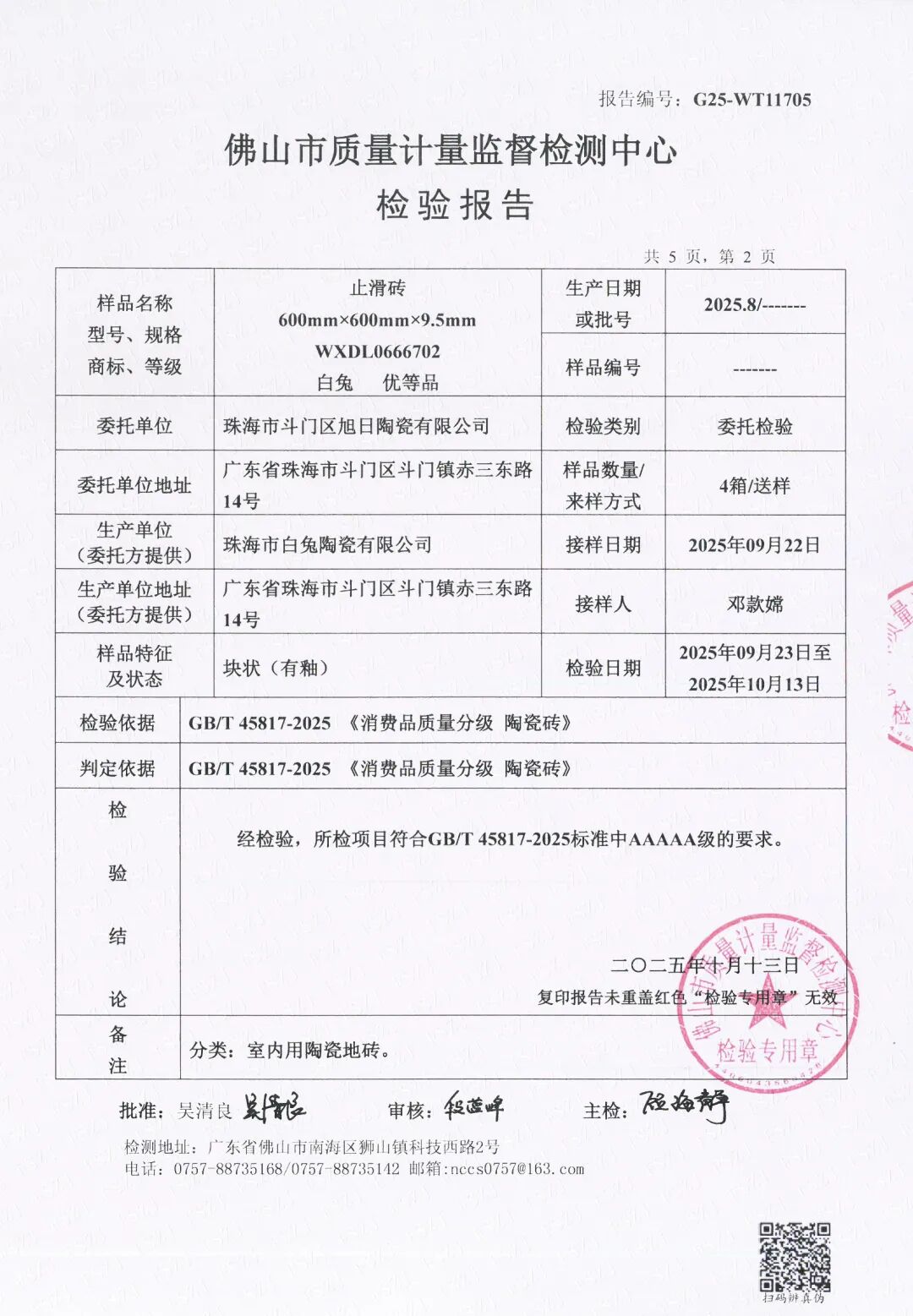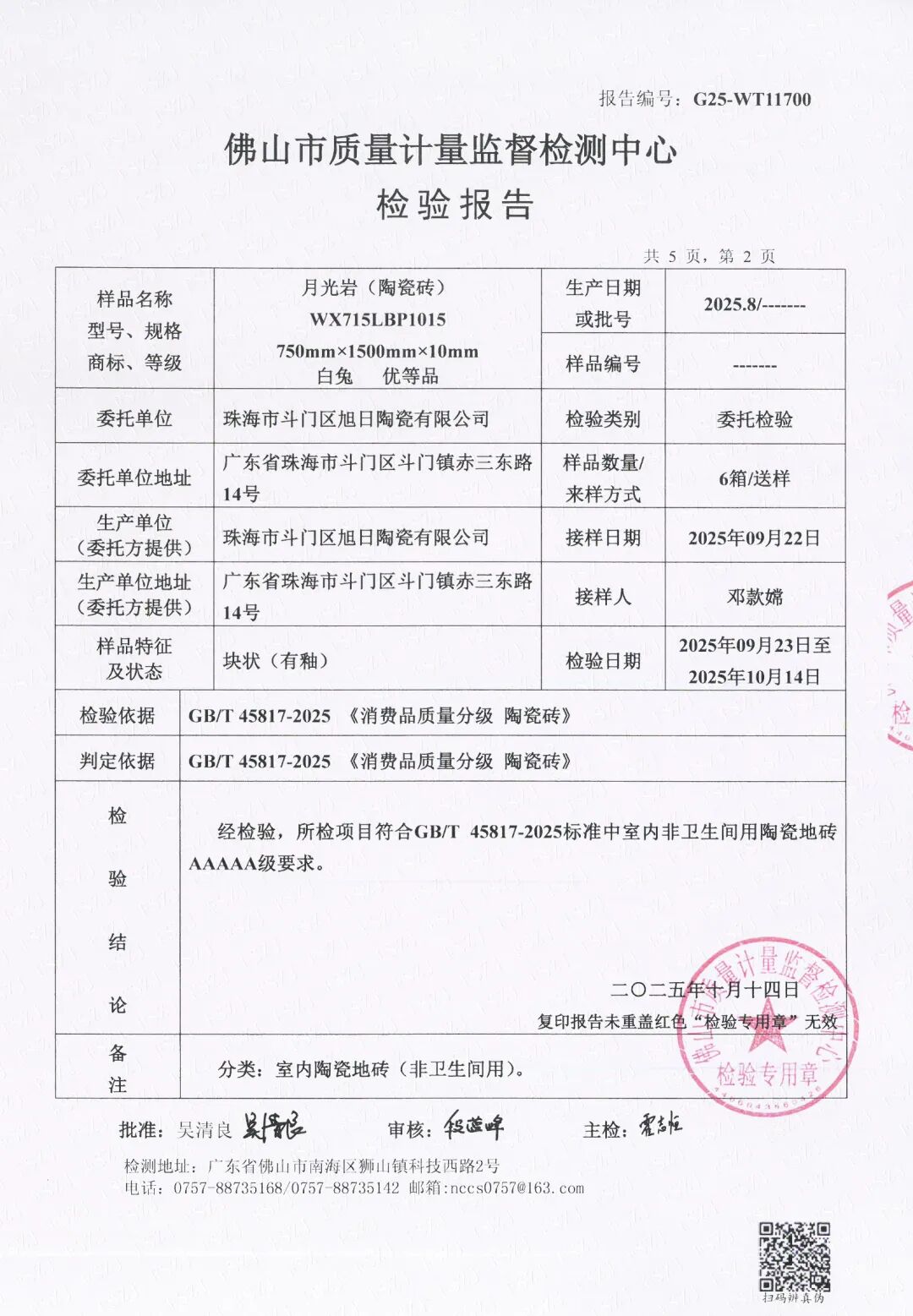 在“双品驱动,三砖融和”的品牌战略指引下,将墙地砖、马赛克、外墙砖三大品类纳入统一品质管理框架,打破传统品类壁垒,更搭建起“原料 - 生产 - 检测 - 应用”的全流程追溯机制,全面保障产品品质与系统服务能力。对我们来说,通过5A检测是荣誉加冕,更是核心竞争力的印证,也是对白兔追求高质量发展的认可和肯定。