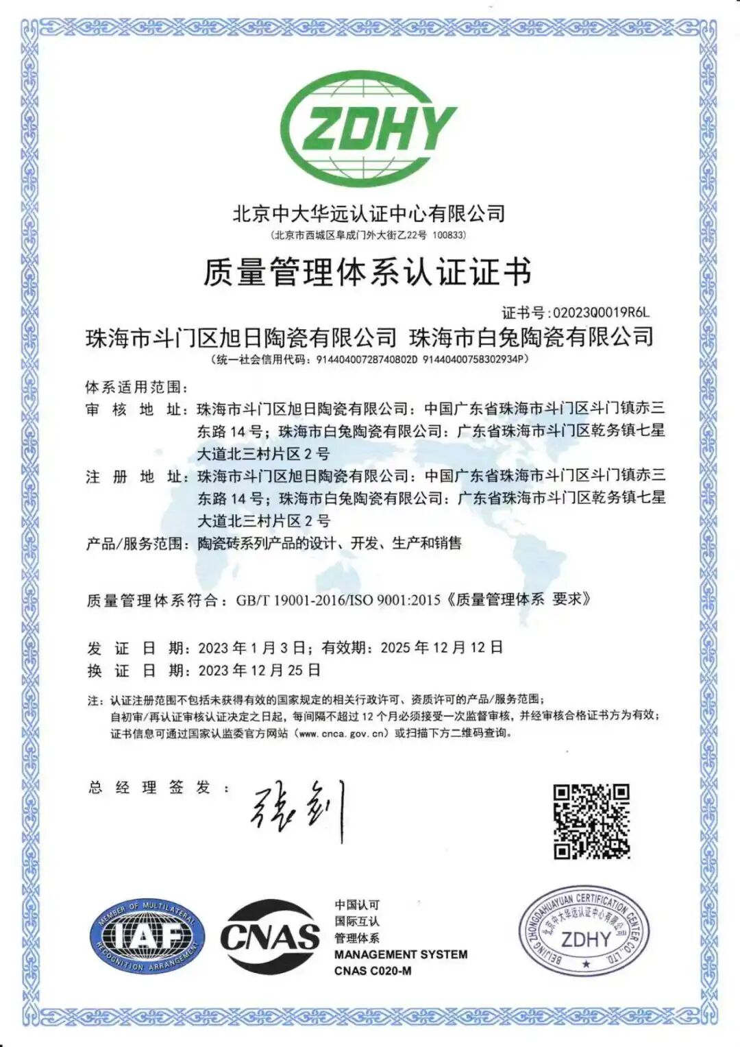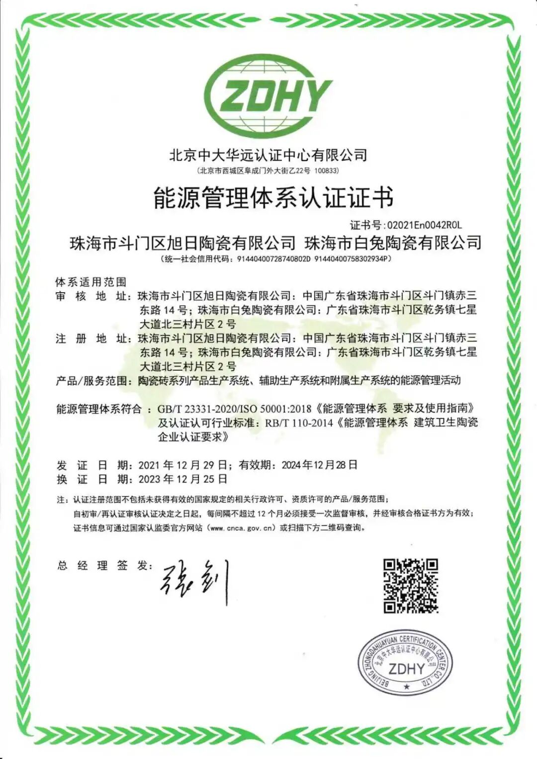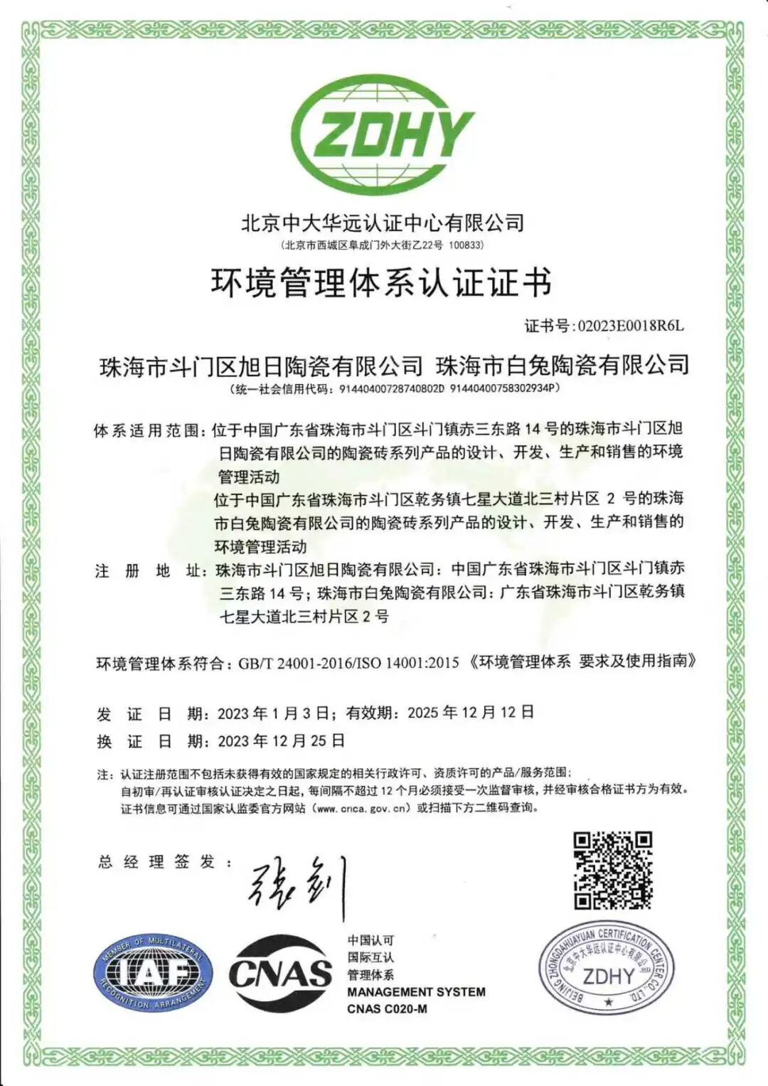 白兔瓷砖深耕建陶行业 26 年的品牌积淀与技术硬实力,是其斩获 5A 认证的核心根基。作为行业内的领军品牌,白兔瓷砖已累计开发出50多个产品系列、超过28000种花色,获得研发专利300余项,并深度参与了4项国家、行业及地方标准的起草与制定工作。品牌在广东珠海、江门及湖南攸县布局了四大现代化建筑陶瓷生产智造基地,依托32条全自动智能生产线实现标准化高效生产,并严格实施IS09001国际质量管理体系、ISO14000国际环境管理体系、ISO51001能源管理体系和国家3C强制性产品认证体系等。