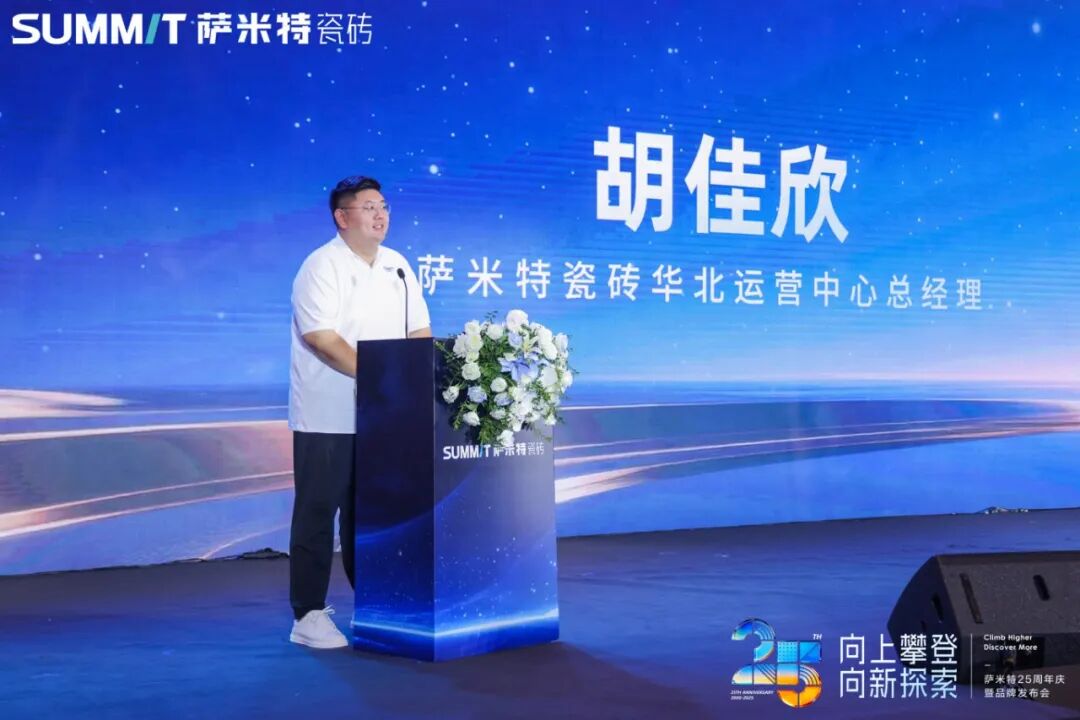 榜样总能够激发前行的力量。萨米特瓷砖华北运营中心总经理胡佳欣作为优秀经销商代表上台,分享他的“攀登故事”。他说:“25年不是一个终点,而是一个新的起点。市场永远在变,但只要我们内心这份“探索极致”的劲头不止,这份对行业、对品牌、对客户“热爱”的初心不止。”