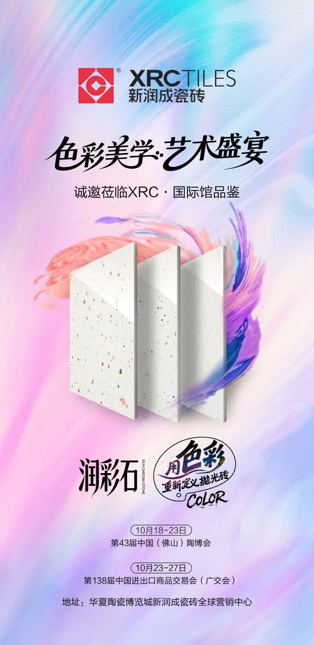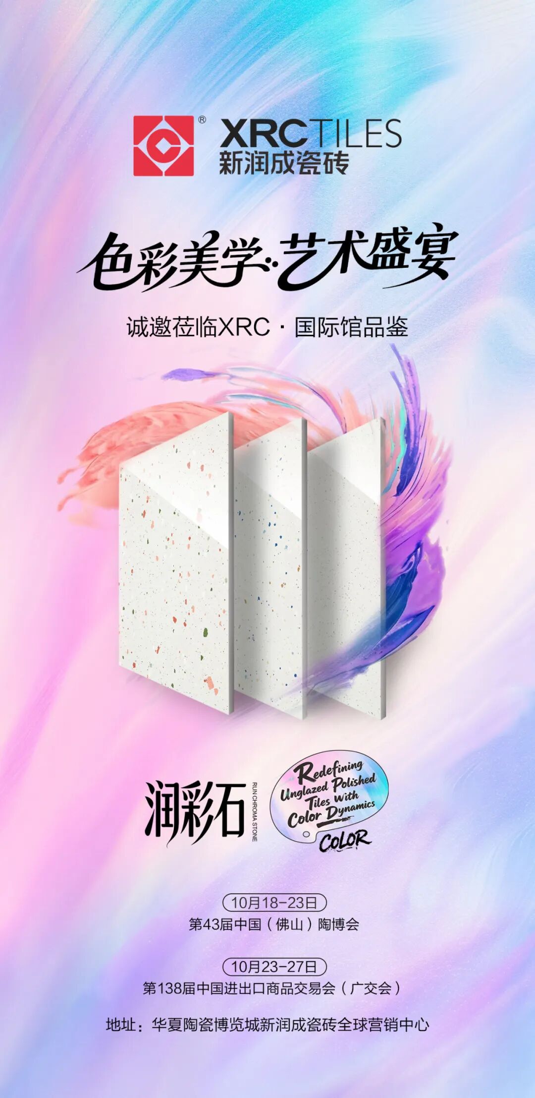 新润成瓷砖携全新「润彩石」系列重磅亮相,诚邀全球友商、行业伙伴于 10 月 18 日 - 23 日(第 43 届佛山陶博会)、10 月 23 日 - 27 日(第 138 届广交会),莅临 XRC・国际馆,共鉴瓷砖色彩与艺术的双重革新!