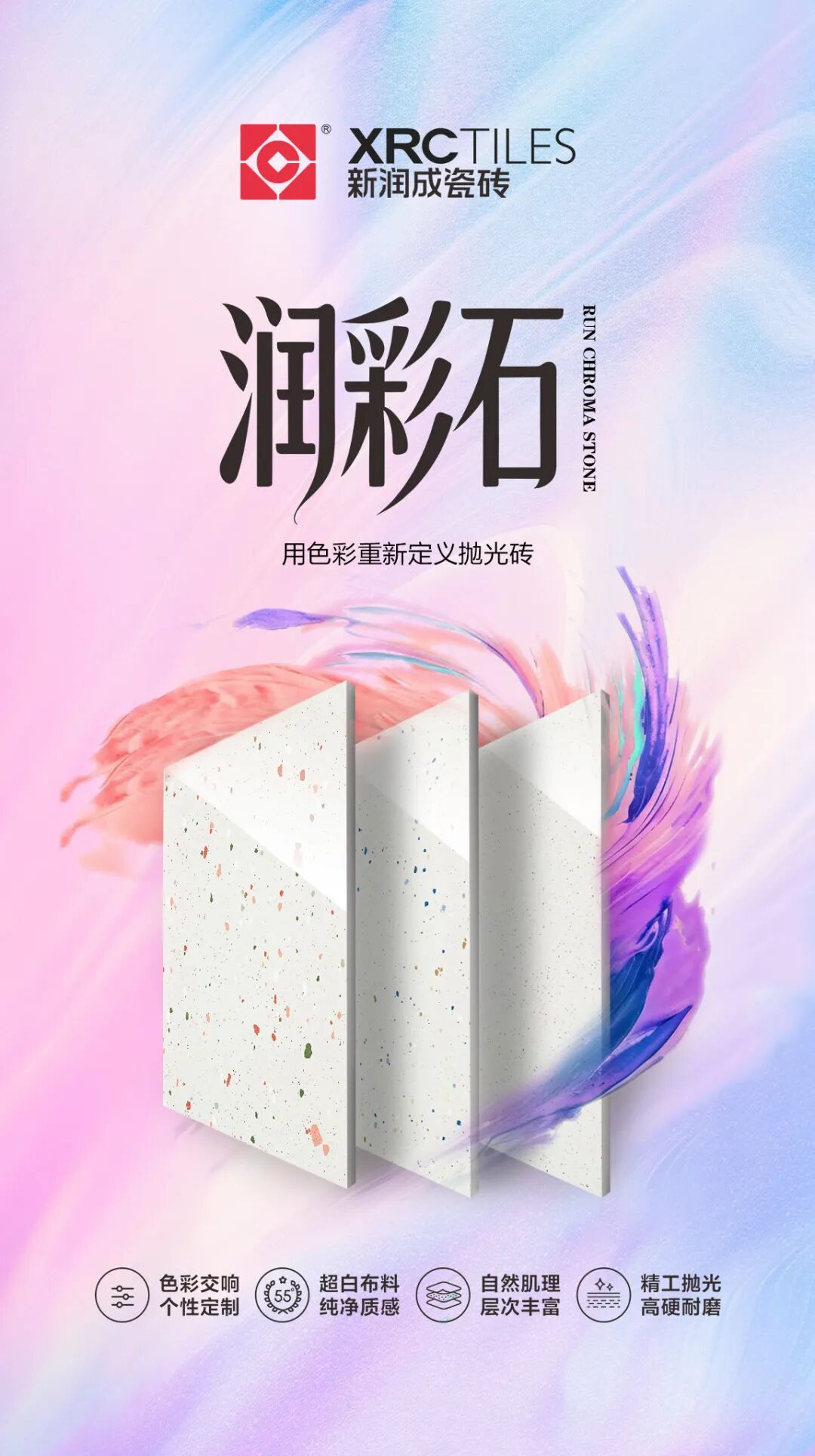 厌倦了传统抛光砖的单一素色?「润彩石」系列用色彩重新定义抛光砖!以“55° 超白布料”还原色彩本真,用“随机布料”复刻自然的色彩和肌理,叠加精工抛光工艺,让大中小彩色色块/颗粒/斑点自然交织。融入国际化的设计语言,将“个性化定制”提供给客户。