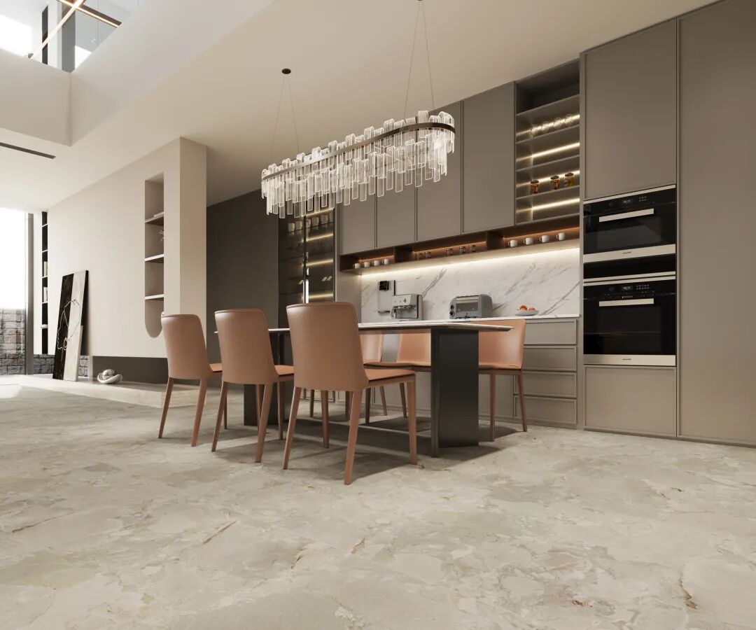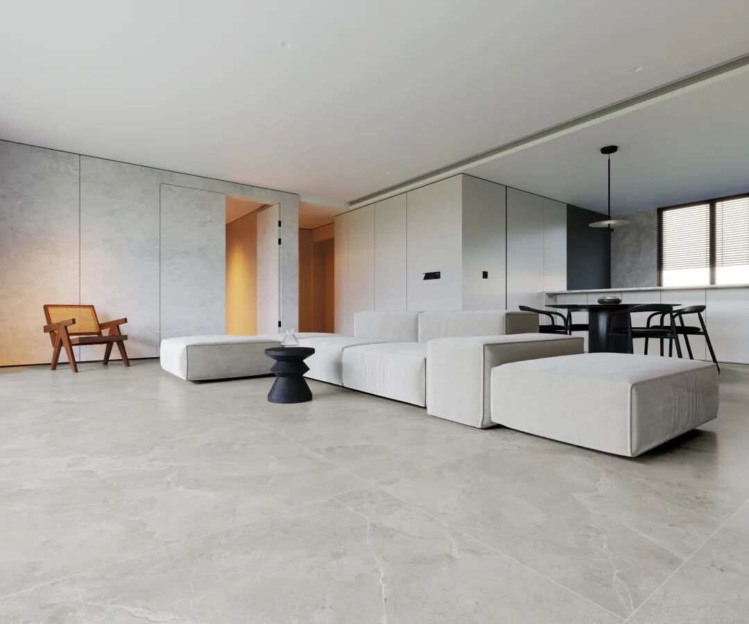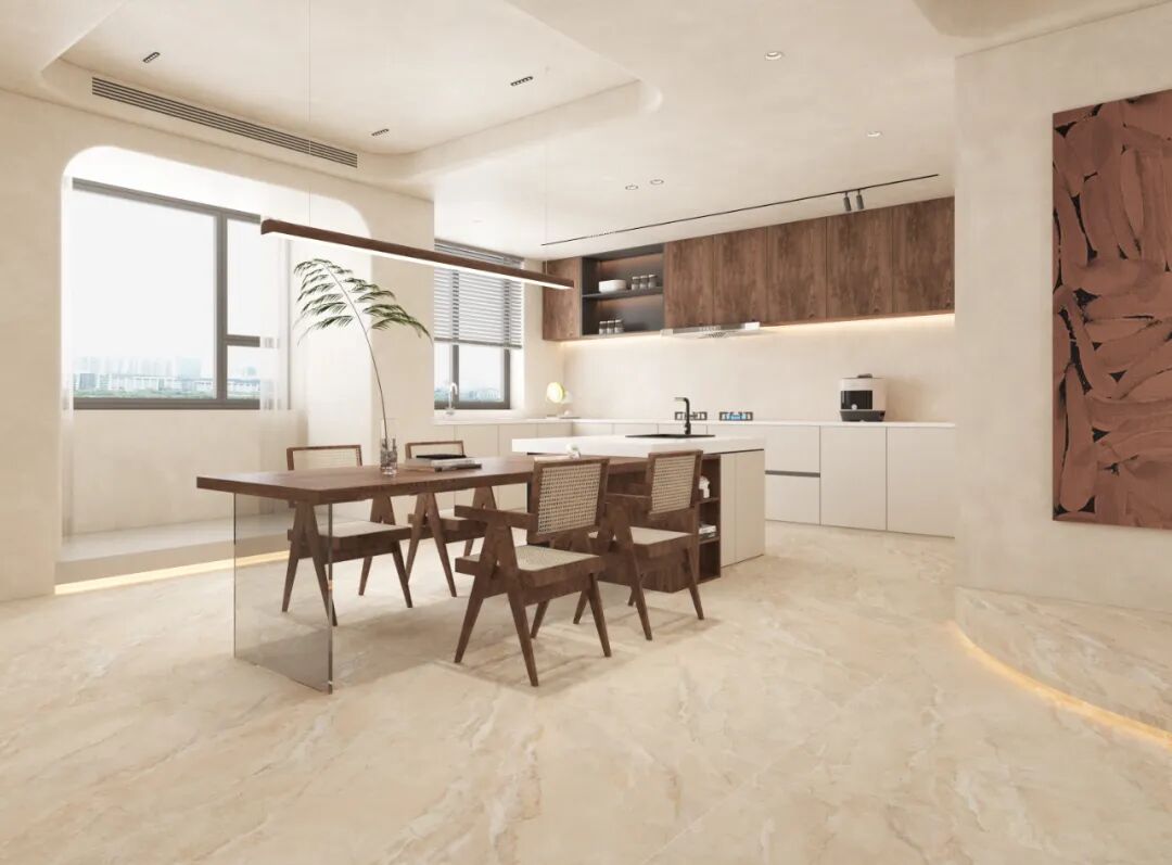 这种特殊工艺同时赋予砖面25°的自然石光,在室内不同光照条件下,瓷砖能保持恰到好处的视觉舒适度,不会产生刺眼反光,同时又能适当保持舒适光感亮度,营造出和谐的生活场景。