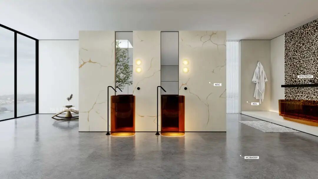 创作灵感来源于古代的金缮技术,曾为贵族专属的修复艺术,以黄金缀合破碎陶器的裂痕,以现代30数码打印与顶尖陶瓷生产工艺,将“残缺美学”转化为砖面上流动的乳光金纹。