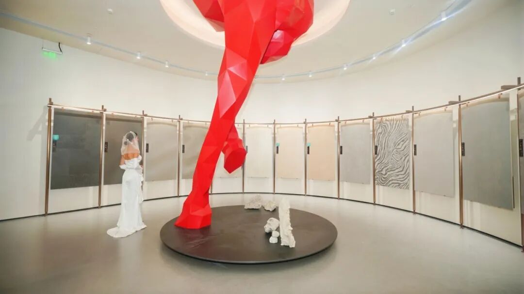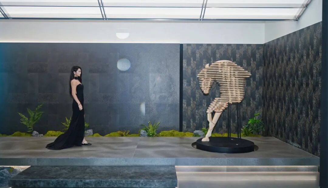 空间中央,一座红色马蹄雕塑昂然跃起,在静谧的基调中注入昂扬的品牌精神,诠释着瓷砖作为“空间美学语言”的无限可能。