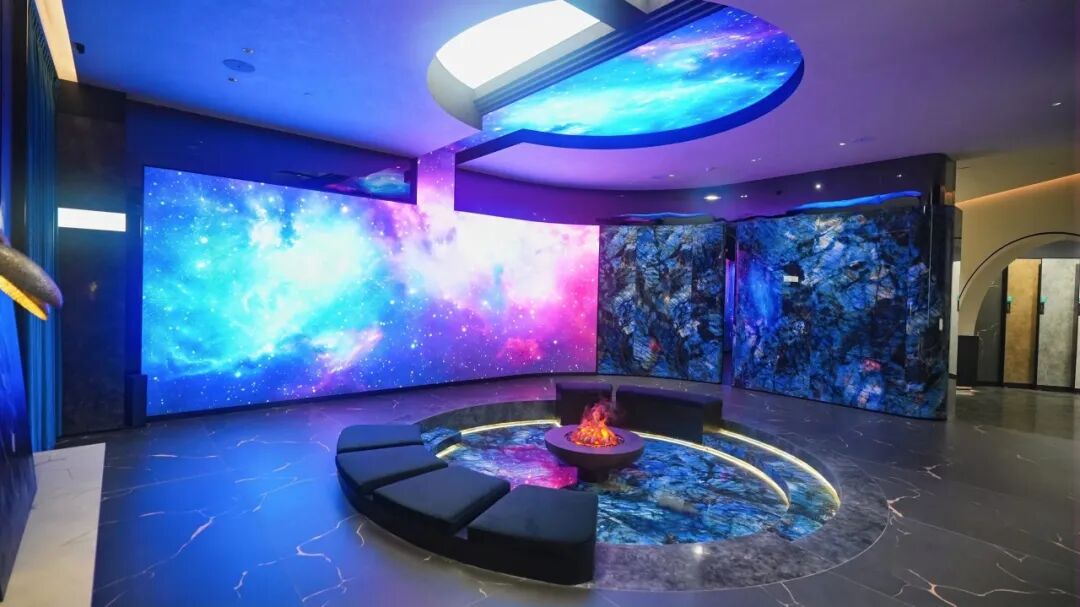 与之呼应的岩板展厅,则构建了一个未来感十足的沉浸剧场。圆形壁炉与悬浮玻璃立柱围合出仪式感的场域,弧形墙面采用蓝色透光岩板,在光影作用下呈现如深海或星空的幻境。