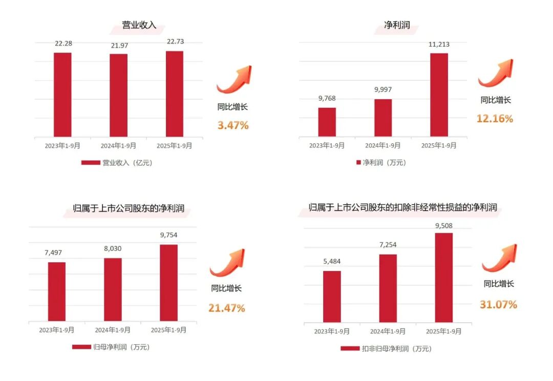 公司第三季度实现营业收入15.67亿元,与上年同期基本持平;归属于上市公司股东的净利润1.03亿元,同比增长32.91%。