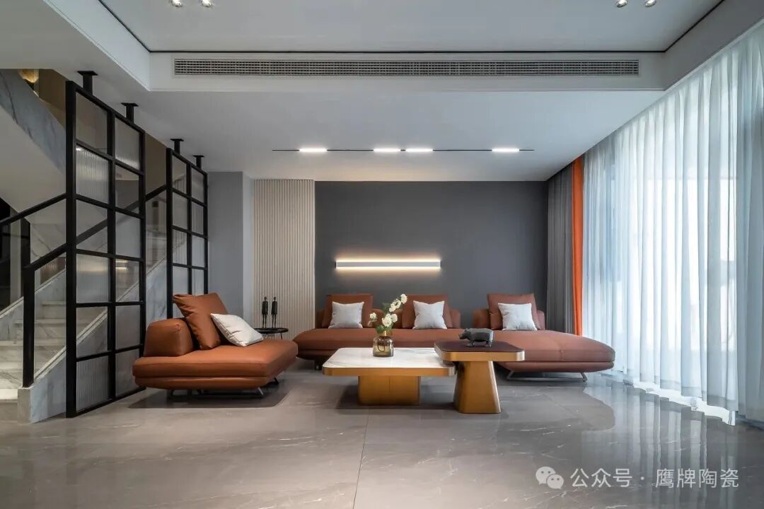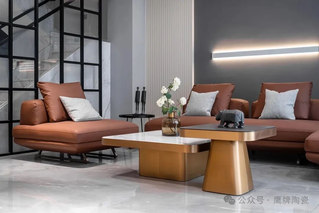 以鲸MAX系列-幻影灰为基底,瓷砖的冷冽质感与焦糖色真皮沙发形成材质对话,金属线条的茶几与之呼应,在光影交错间,将轻奢的精致感与空间的通透感糅合得恰到好处。
