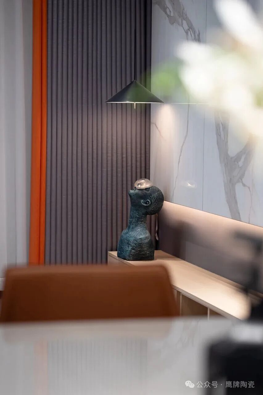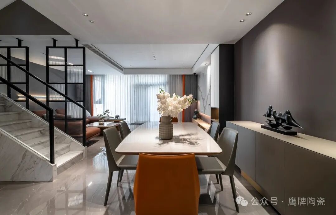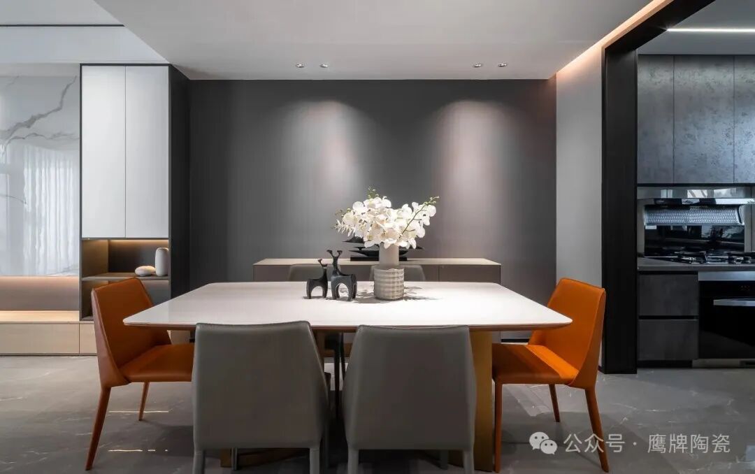 瓷砖的通透质感在提升空间开阔性之余,更与橙色家具的色彩张力结合,为餐厅增添了一分精致之感;