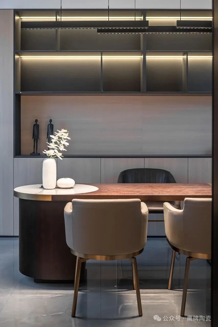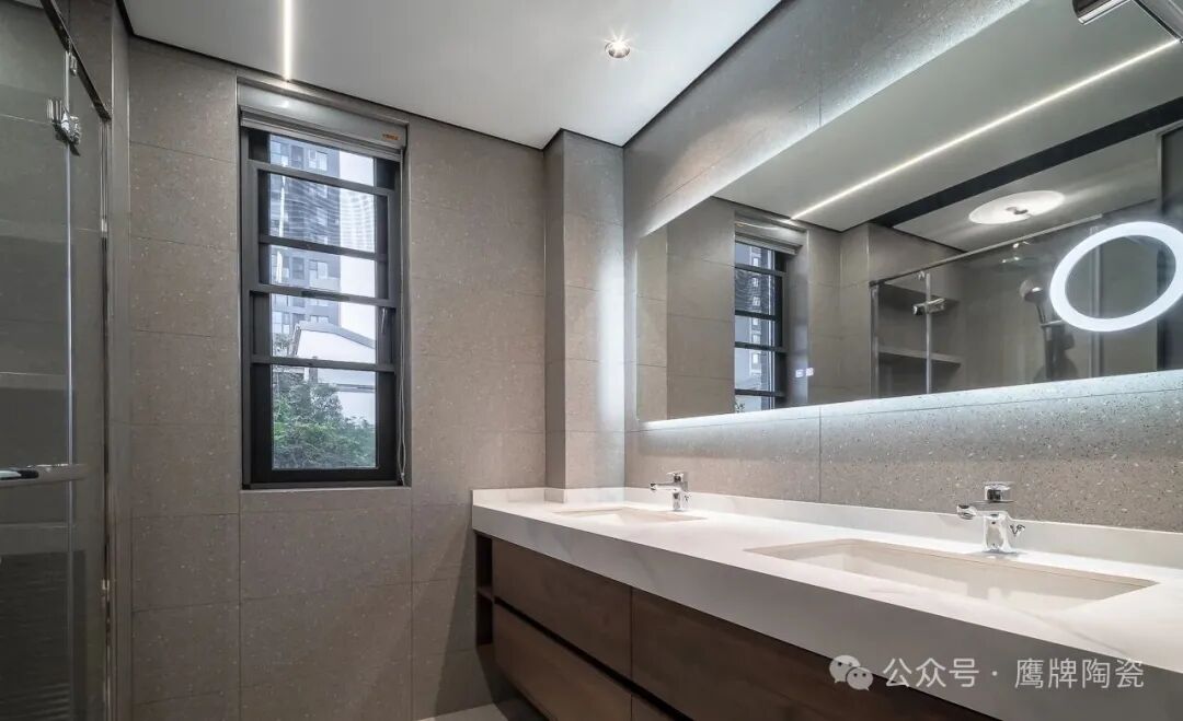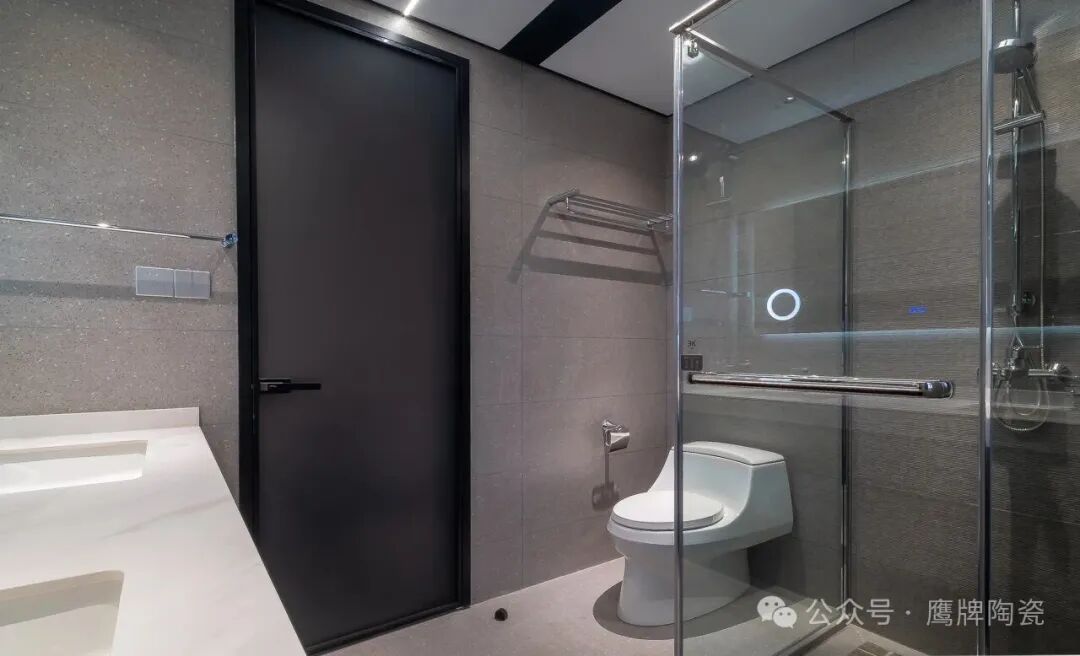 全屋地面通铺鹰牌陶瓷-鲸MAX系列-幻影灰K8GF13DE,整体空间高级感拉满,展现了屋主对现代都市生活品质、功能与美学的卓越追求。