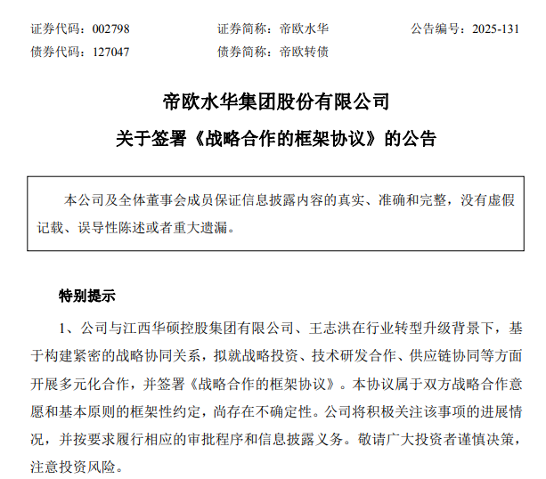 10月25日,帝欧水华发布公告称,其与江西华硕控股集团有限公司、王志洪签署《战略合作框架协议》,拟在战略投资、技术研发合作、供应链协同等领域开展多元化合作,以提升双方在陶瓷产业的核心竞争力与供应链优势。