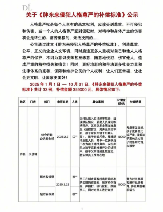 该文件名为《关于〈胖东来侵犯人格尊严的补偿标准〉公示》,详细列出了胖东来为2025年1月至10月期间33例内部管理过失对员工人格尊严造成的侵害所支付的总计35.9万元的补偿。