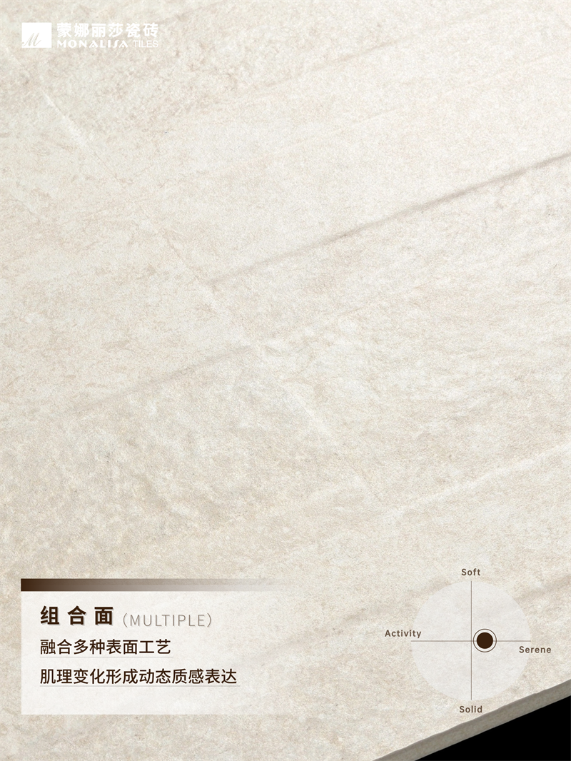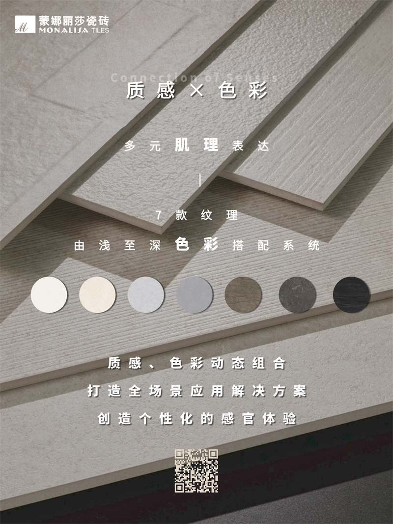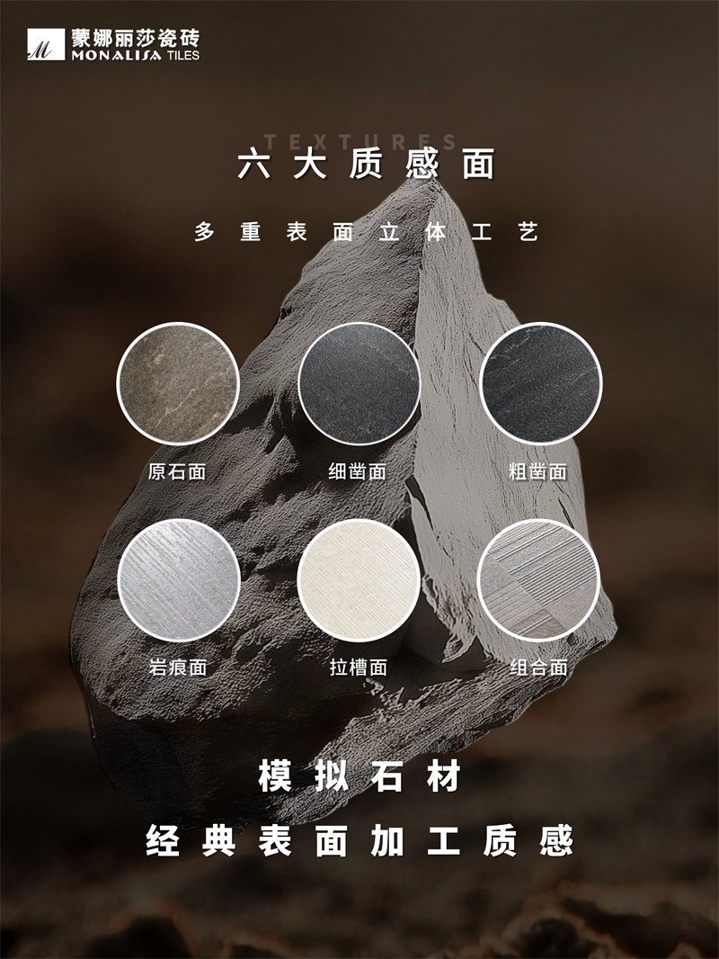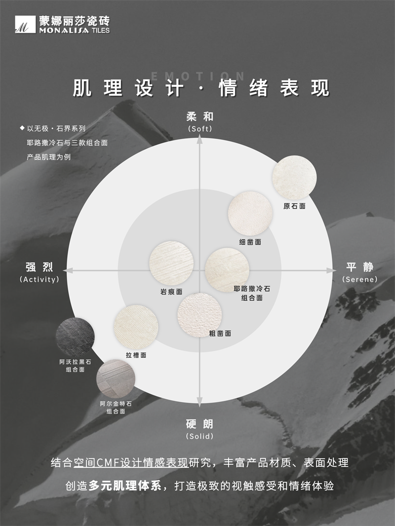 蒙娜丽莎无极·石界高端系列,结合空间的CMF设计情感表现研究,创造多元肌理设计体系,通过质感的变化,更新居者对材料、设计美学的感受与认知。
