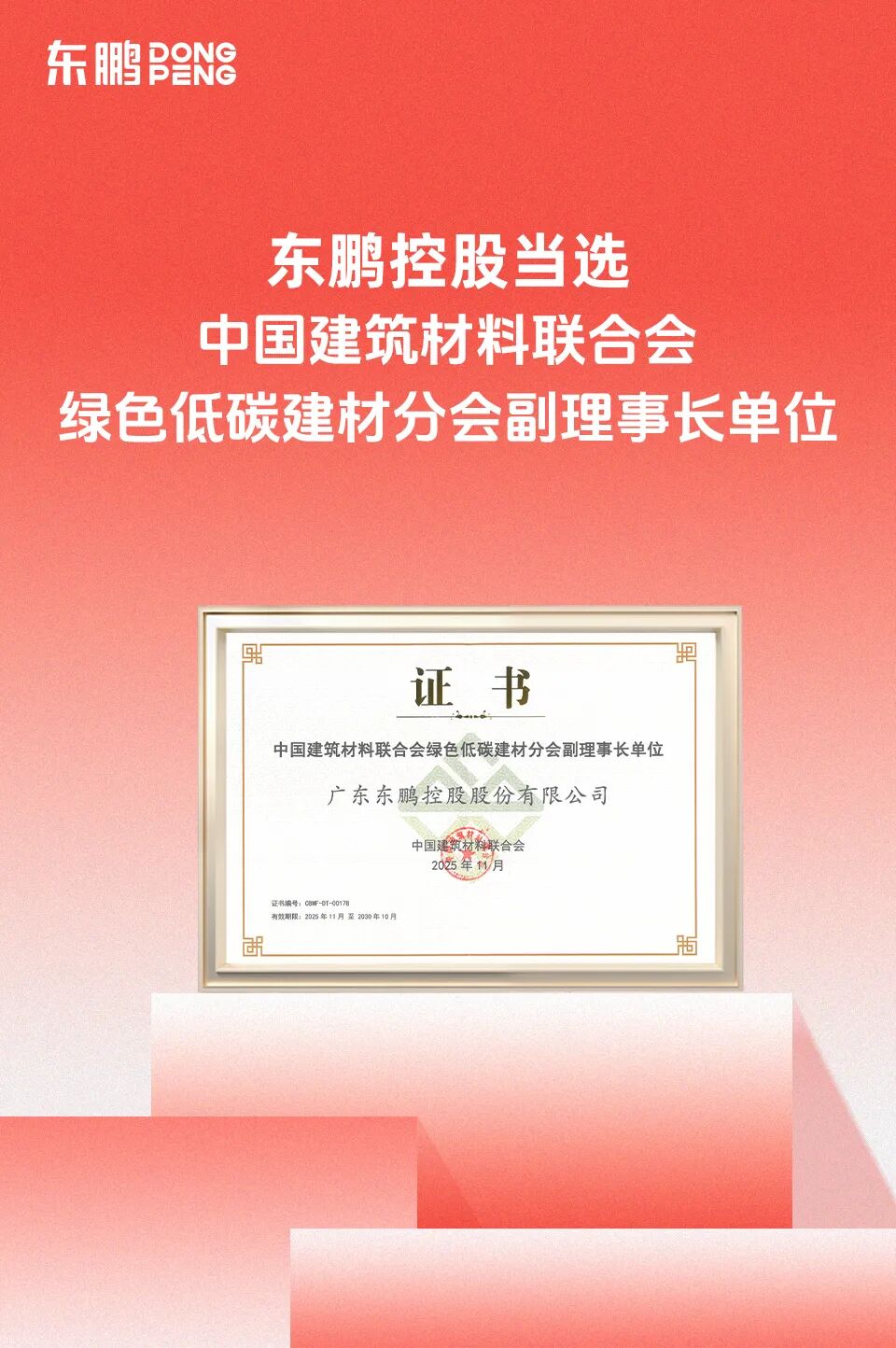 近日,中国建筑材料联合会绿色低碳建材分会第二次会员大会暨建材行业绿色低碳发展推进大会在山东青岛成功举办。东鹏控股受邀出席并当选为绿色低碳建材分会第二届理事会副理事长单位。