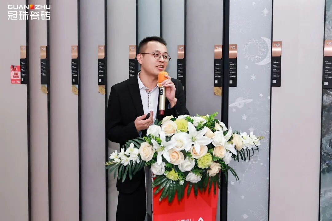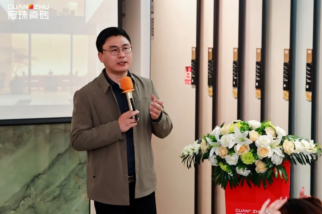 佛山冠珠瓷砖营销总监刘路兴向大家重点展示佛山冠珠专业的团队及服务体系,从选材到交付,专业、高效的服务团队是设计师最坚实的后盾,也是赢得业主口碑的关键。