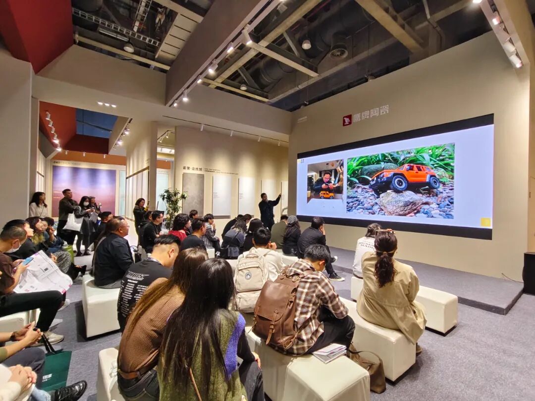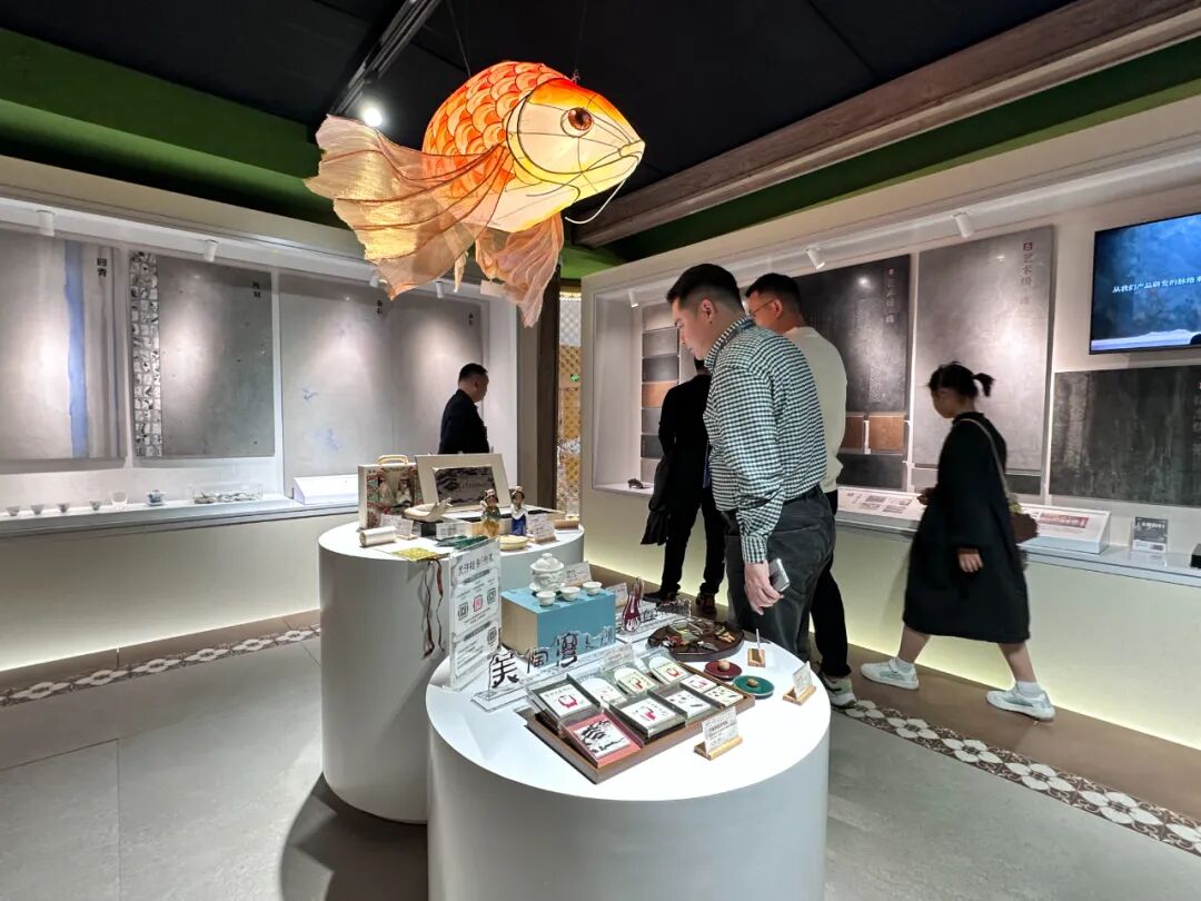 展馆内还陈列了广东石湾陶瓷博物馆的文创产品和陶艺家作品、非遗传承人罗志环老师亲手打造的七彩锦鲤鱼灯、铜凿剪纸纹样的背景墙......无不透露出岭南文化的精髓。