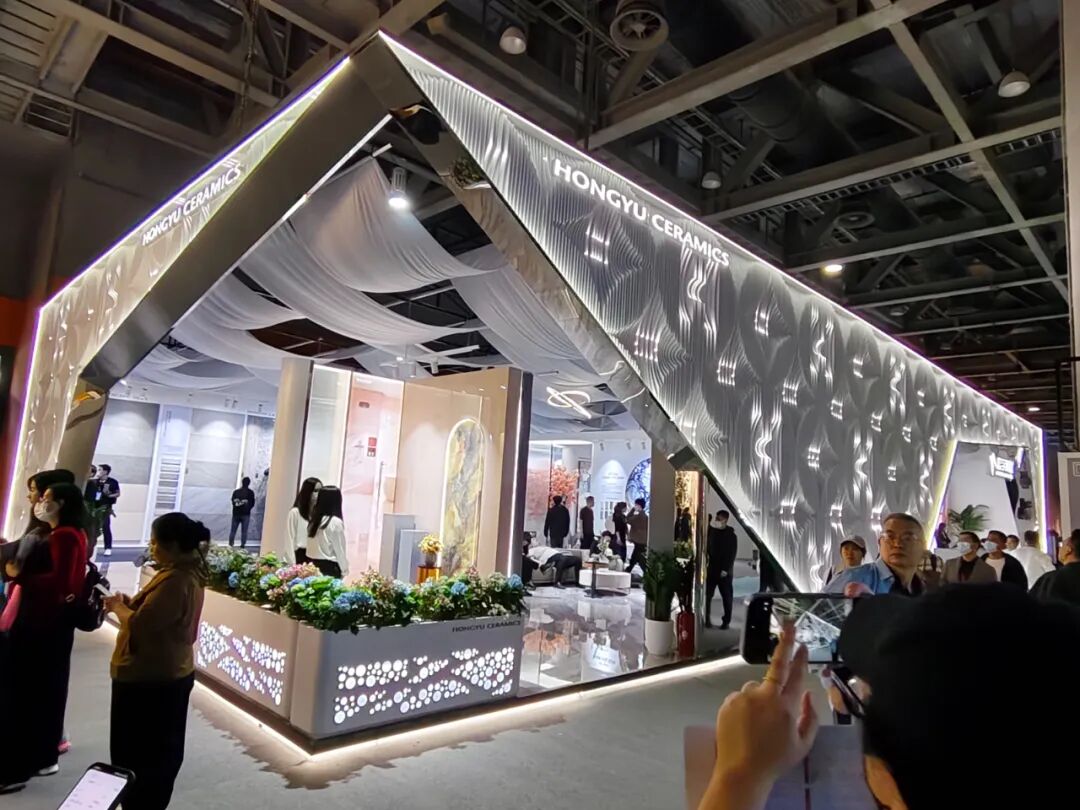 现场,宏宇重点展出了“星链计划”的产品——星钻IV代、星绣、星纹以及瑰丽石系列等,展现高端人居生活场景。展位亮点是,宏宇以 “家居场景化”为核心——把瓷砖展品融入客厅、休闲区等真实空间,搭配樱花树、绿植等柔美元素,让“星际质感”落地为可触摸的生活场景,既展示了产品的应用效果,也弱化了商业展陈的生硬感。