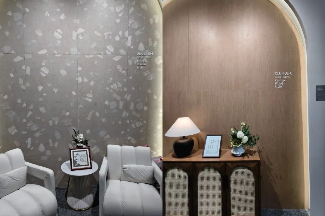 此外,斯米克还打造了“四季瓷韵”“自然三境”“岩语风尚”三大特色产品展区,用不同的产品系列搭配组成多种独特的场景主题,展示斯米克瓷砖的设计多样性与创意融合。例如“四季瓷韵”营造了春夏秋冬的季节氛围;“自然三境”分别从秩序、律动、活力三个维度诠释自然与艺术的融合;“岩语风尚”则是法式奶油、现代轻奢、原木中古三种流行家居风格的场景体验。