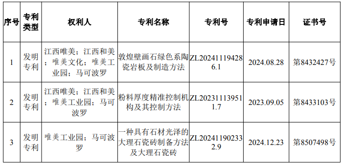 12月2日,帝欧水华发布公告称,公司下属子公司欧神诺陶瓷近日收到国家知识产权局颁发的16项发明专利证书。专利名称分别为:一种玉质釉的釉料、陶瓷砖及其制备方法;一种效果逼真的仿石材陶瓷砖及其制备方法;一种闪光陶瓷干粒釉、陶瓷砖及其制备方法;一种釉面装饰陶瓷岩板及其制备方法;一种双面装饰陶瓷岩板及其制备方法;一种仿丝绸釉面效果的陶瓷砖及其制备方法;一种基于贝壳粉的多孔轻质陶瓷砖及其制备方法;一种玉质变色陶瓷干粒釉、陶瓷砖及其制备方法;一种表面具有珐琅彩装饰效果的瓷砖及其制备方法;具有蛋壳面釉面质感的陶瓷釉料及其制备方法、陶瓷岩板;一种光敏隐形防伪陶瓷墨水及其制备方法与应用;一种光敏隐形防伪陶瓷岩板及其制备方法;一种隐形防伪陶瓷墨水、陶瓷砖及其制备方法;一种瓷片及其制备方法;一种陶瓷浆料的球磨方法;一种有色面釉、深色砖及其制备方法。