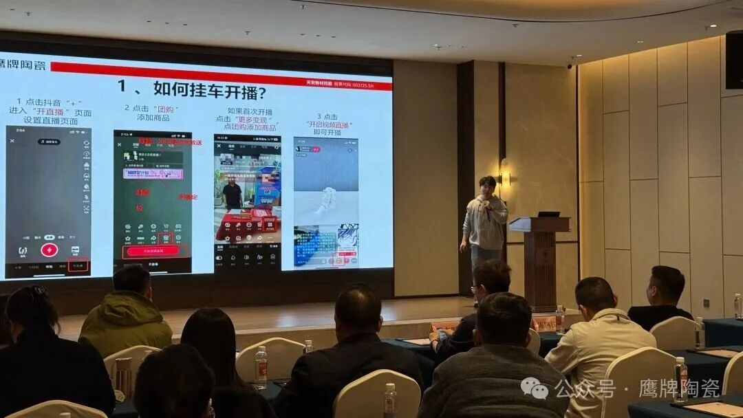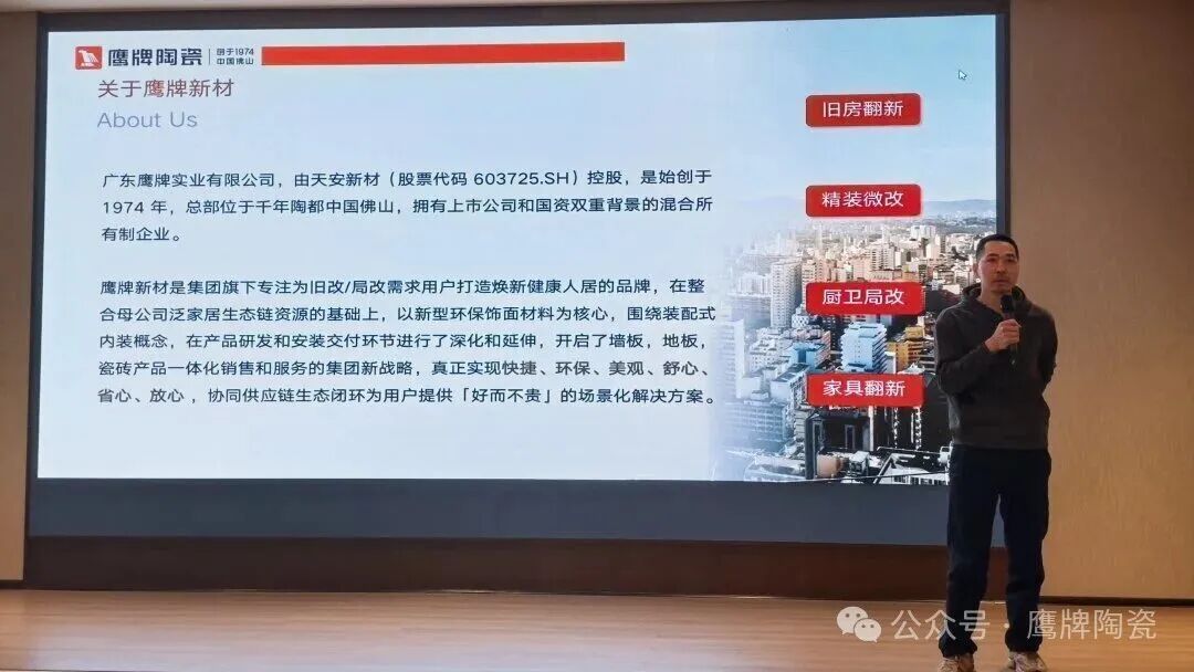 为助力终端提升综合竞争力,会议设置了一系列干货满满的赋能课程。鹰牌总部市场部讲师针对线下自然客流稀缺的普遍痛点,为经销商伙伴提供了一套系统化的抖音运营落地思路,助力门店抢占流量,精准获客。鹰牌新材部讲师也针对新材产品进行了全面讲解,深化经销商伙伴对旧改时代的产品认知和市场认知,提升终端服务专业度。