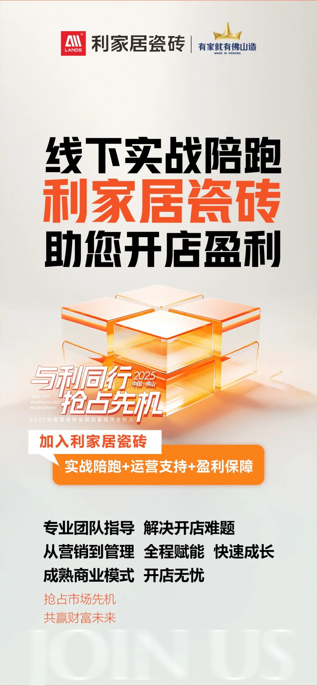 第42届佛山春季利家居陶博会盛大启幕之际,一场席卷全国的招商风暴正以雷霆之势全面铺开,利家居瓷砖凭借强大的品牌实力与前瞻性的市场布局,强势覆盖全国空白市场。现诚邀有实力、怀揣梦想的创业者携手同行,共赴财富新征程。为助力经销商快速成长、稳健发展。