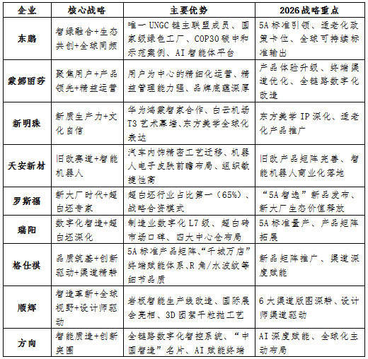 政策卡位战:2026年,我国首个《好材料选材通则》开始实施,健康、安全、绿色、优质四大指标将与5A标准形成“叠加效应”;“好房子”建设、适老化改造等国家政策将释放定向需求。东鹏、新明珠、简一、索瓷等已入选名录的企业将抢占政策红利。能否进入各级政府采购目录,可能为部分企业开辟新的增长空间。