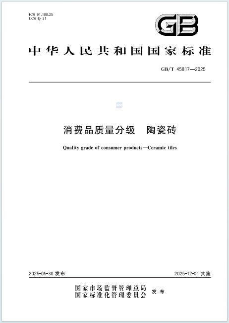值得一提的是,2025年12月1日起新增的GB/T 45817-2025《消费品质量分级 陶瓷砖》仅作为质量分级补充依据。该标准首次建立陶瓷砖量化分级体系,将吸水率≤3% 的陶瓷砖分为 “AAAAA (5A,国际领先)、AAAA (4A,国际先进)、AAA (3A,国内领先)”三个等级,补充细化关键指标要求(如平整度、尺寸差、耐磨防滑、辊棒印等),为质量抽检提供更精准的分级判定依据,但不替代GB/T 4100-2015《陶瓷砖》。