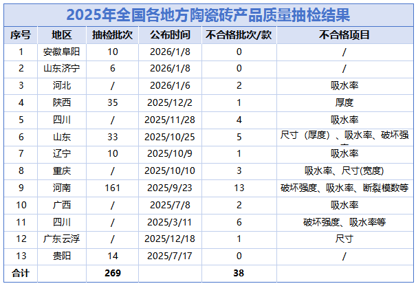 近日,河北、陕西、四川、山东等地市场监管部门先后公布了陶瓷砖产品质量抽检结果。据中陶君不完全统计,2025年以来共有38批次陶瓷砖抽检不合格。