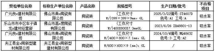 2025年11月28日,四川省市场监督管理局公告了2025年省级监督抽查不合格产品清单(第九次)。按照年度产品质量监督抽查计划,四川省市场监管局组织开展了2025年第三批等重点工业产品质量省级监督抽查任务,其中发现4批次陶瓷砖吸水率不合格。