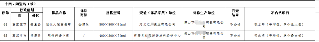 2026年1月6日,河北省市场监督管理局发布铝合金建筑型材等产品质量监督抽查结果,检出不合格样品79批次。其中,陶瓷砖(板)产品检出不合格样品2批次,受检单位涉及河北汇*瓷业有限公司、行唐县松*装饰材料经销中心,不合格产品为800×800mm、400×800mm规格中板,不合格项目涉及吸水率。