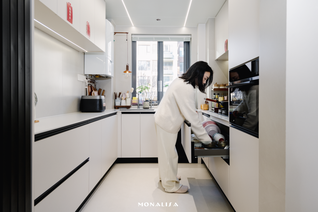 简洁整齐的设计,搭配耐污、易洁的墙地瓷砖性能,让烹饪也成为了治愈的时刻。