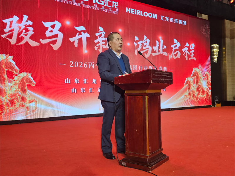 山东汇龙集团董事长姬文代表企业致欢迎辞,向长期关心支持汇龙发展的各级领导、合作伙伴与社会各界表示衷心感谢。姬文董事长回顾汇龙发展历程时表示,汇龙始终坚守实业为本、创新为魂、品质为根的理念,从色釉材料单点突破,到布局未来家居全场景,是战略升级的必然选择,更是服务客户、赋能行业的责任担当。2026 丙午马年,以 “骏马开新” 为喻,寓意汇龙以昂扬姿态开拓新局;以 “鸿业启程” 为志,彰显汇龙深耕产业、共创共赢的长远决心。