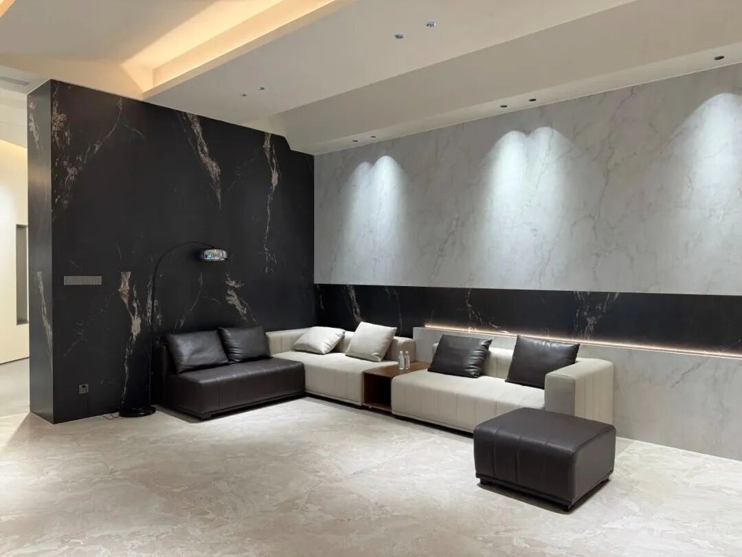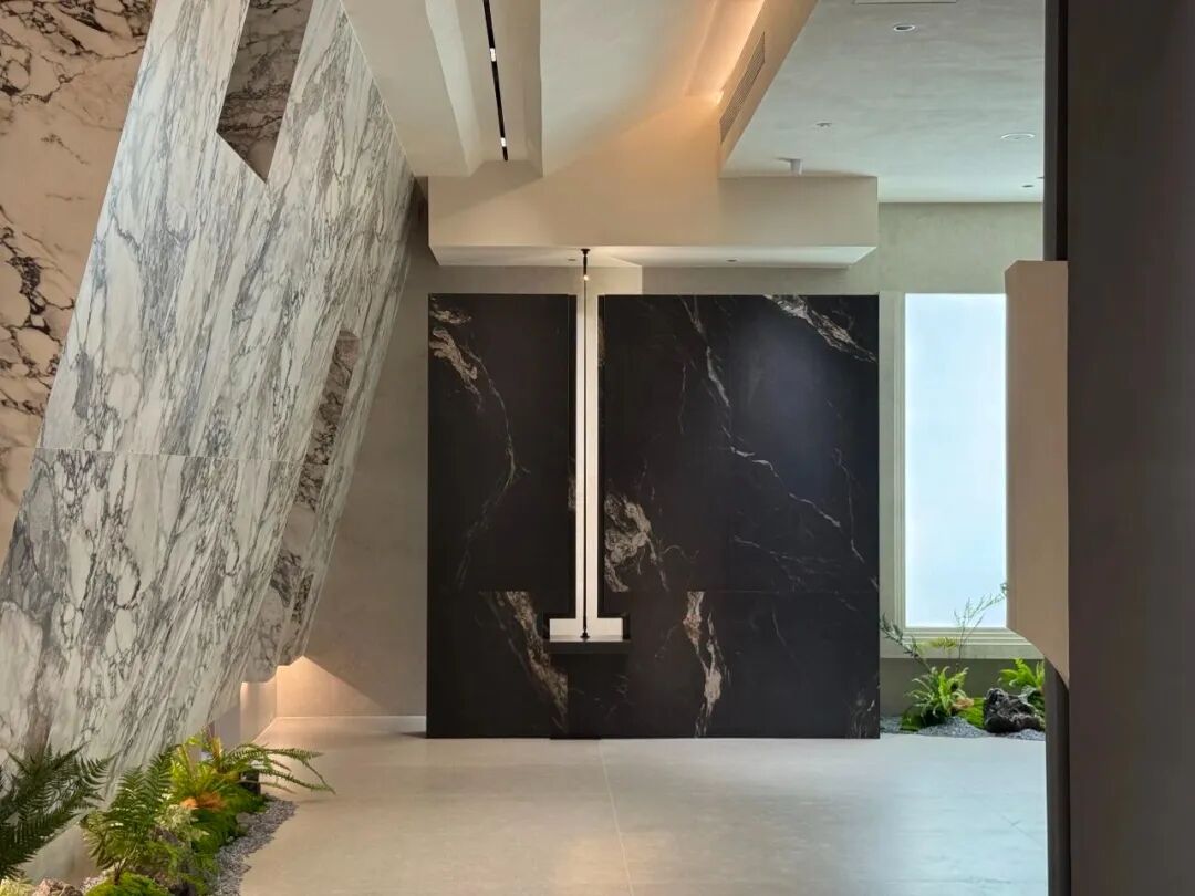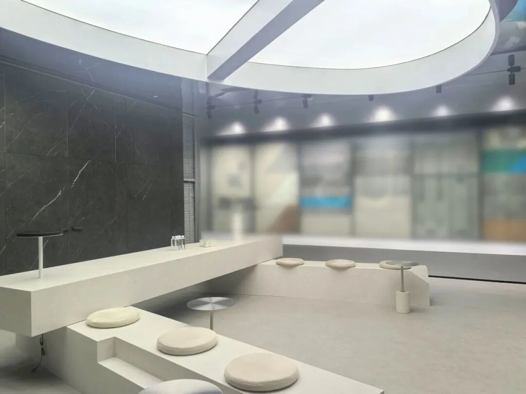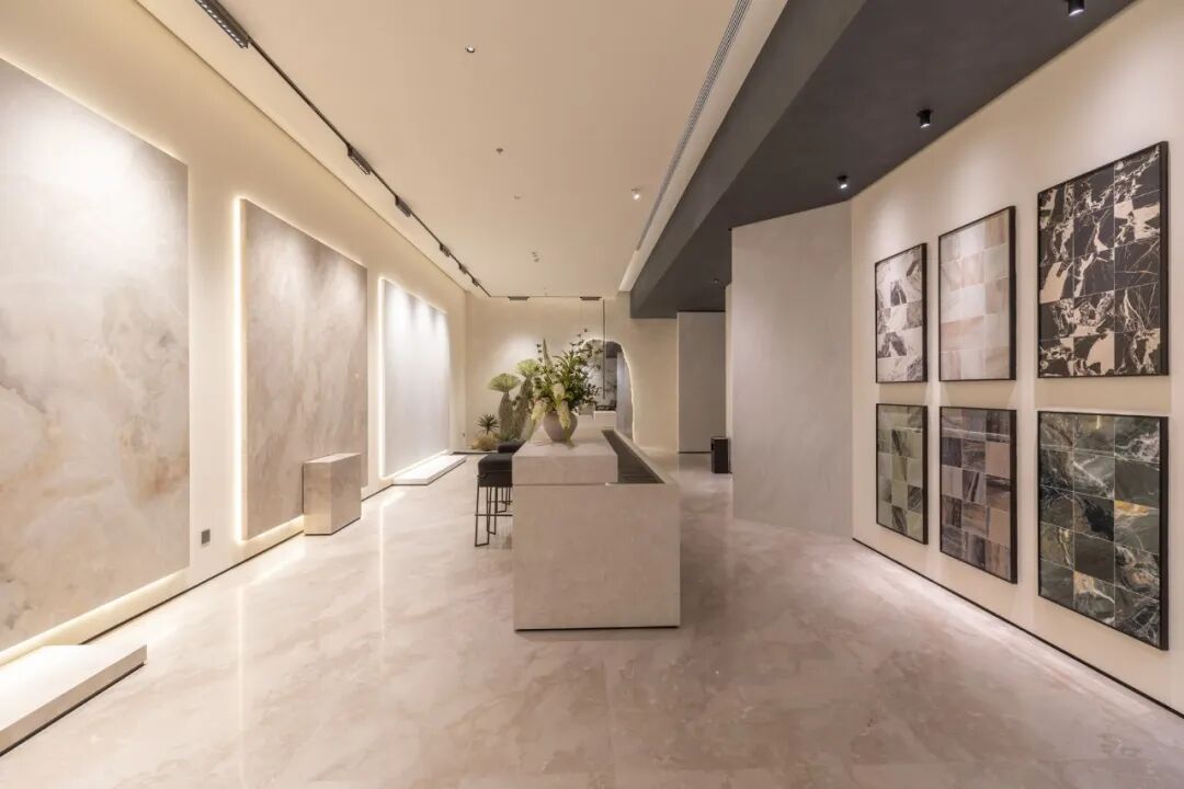 阿隆索(ALONS)微哑砖新展厅以“筑光为诗,栖心为境”为设计主题,通过极简美学与全场景体验的融合,重新定义了瓷砖展厅的叙事逻辑。展厅整体采用灰白为主色调,局部以深色石材与金属线条形成对比,既凸显微哑砖的质感层次,又营造出“艺术画廊般的沉浸感”。
