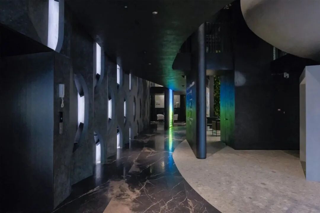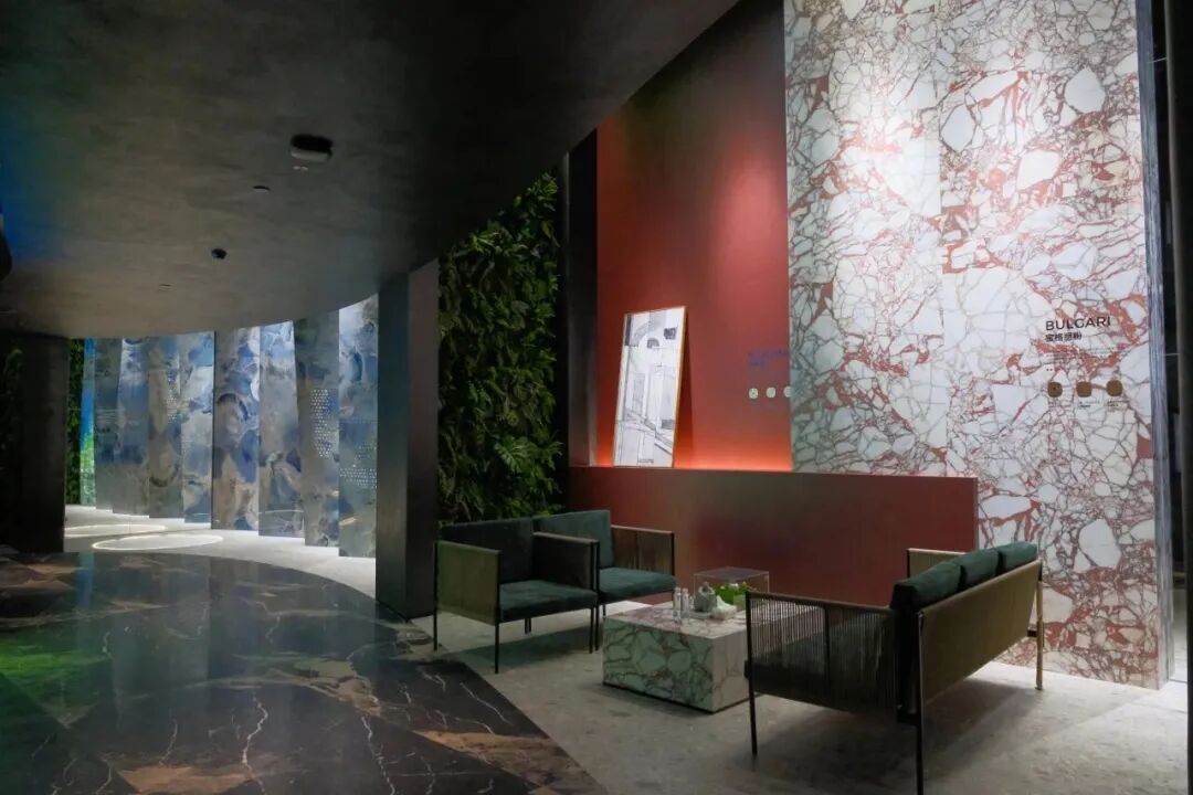随后,视线被引向由岩板包裹、向上延展的“生命之树”,与由废弃电梯井改造而成的叠级水景。空间被清晰划分为情绪层、过渡层与产品层,观众的感受从被自然包裹的沉浸,过渡到对岩板可塑性的震撼,最终落于对奥卓斯8U交付解决方案的信赖。
