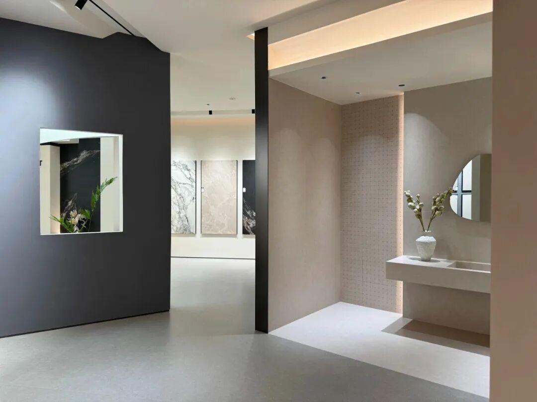 新展厅面积达1000㎡,迎合现代简奢风格,与意特陶注重科技、高端与年轻化的品牌调性一脉相承,上百款瓷砖新品整齐陈列,每一个展区不仅清晰地呈现瓷砖的花色质感与工艺特色,还通过1:1还原搭建了真实家居空间场景,让客户沉浸式体验产品所营造的温馨氛围与生活美学。