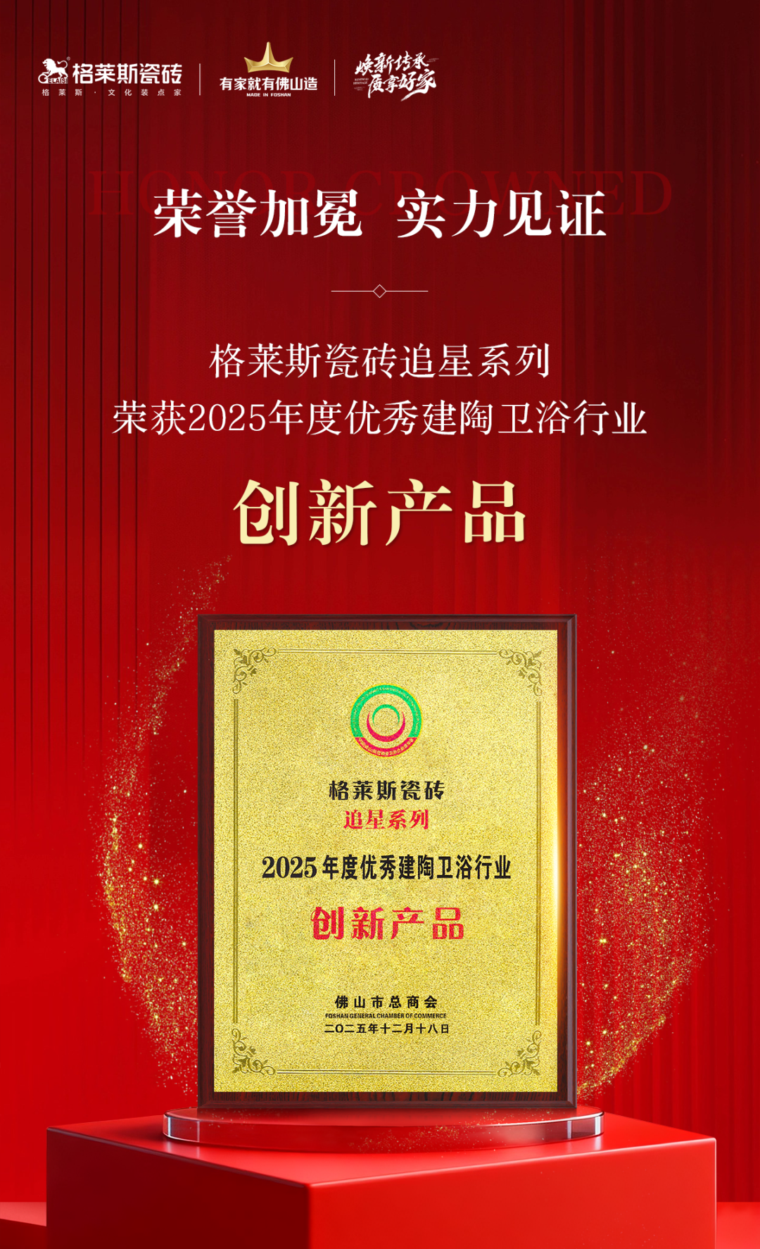 以创新驱动发展,以匠心质造好产品。新系列凭借其独特设计与创新专利工艺获得行业媒体高度关注与认可。12月18日,第二十四届中国(佛山)民营陶瓷卫浴企业家年会在佛山隆重召开,【追星系列】在活动上荣膺2025年度优秀建陶卫浴行业“创新产品”奖项!