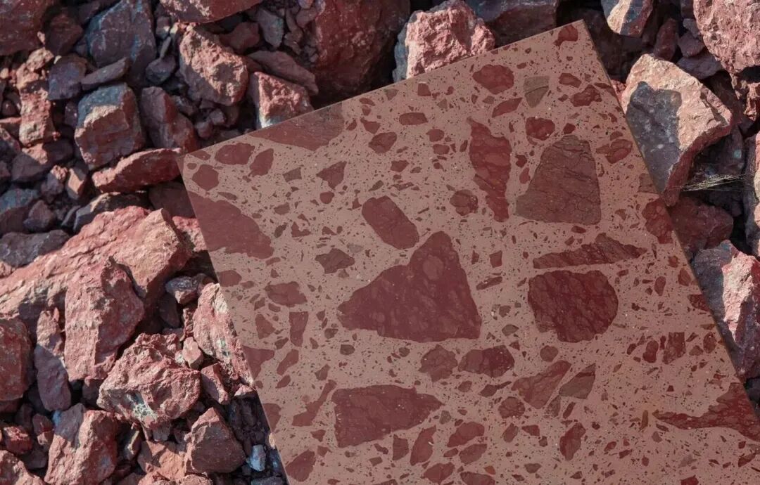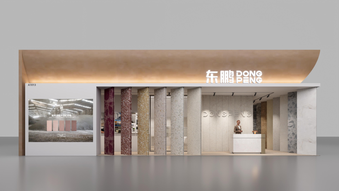 本届展会,东鹏新材的展位设计强调“空间场景”与产品样板的融合,但真正的杀手锏在于其生态石三大系列的全面出击。值得关注的是 “在地生成2.0”系列,该产品利用天然石材余矿和固废打造,通过“超大骨料”这一革命性设计语言,将工业固废转化为极具视觉冲击力的装饰元素。这不仅是对矿山废弃物的资源化利用,更是对石材循环经济的一次美学正名。