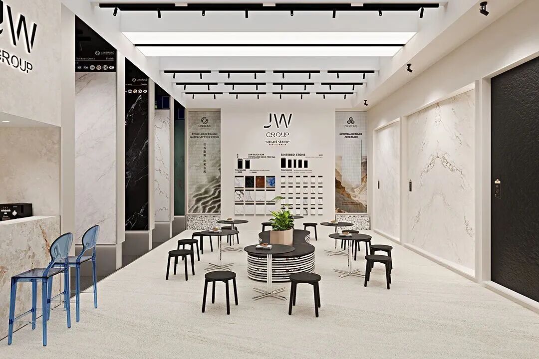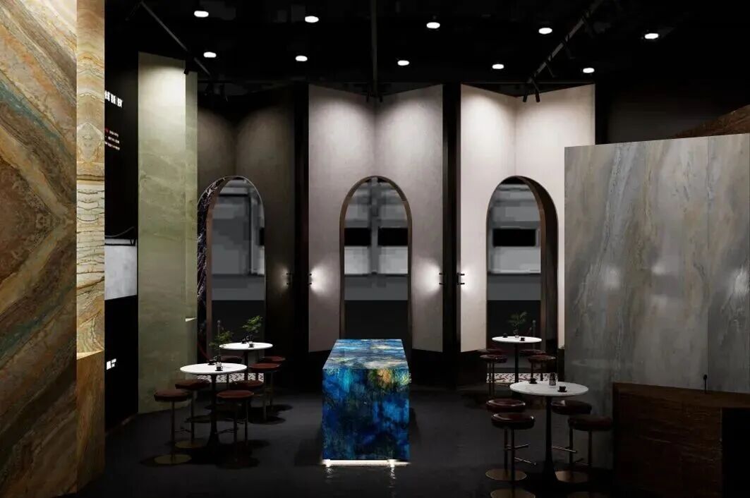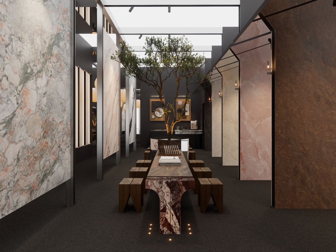 在“内”的空间,岩板回归主角。剥离叙事情境,以纯粹的光影与陈列,聚焦材质本身的秩序——肌理、光泽、尺度。这是专业对话的场域,是理性的回应。