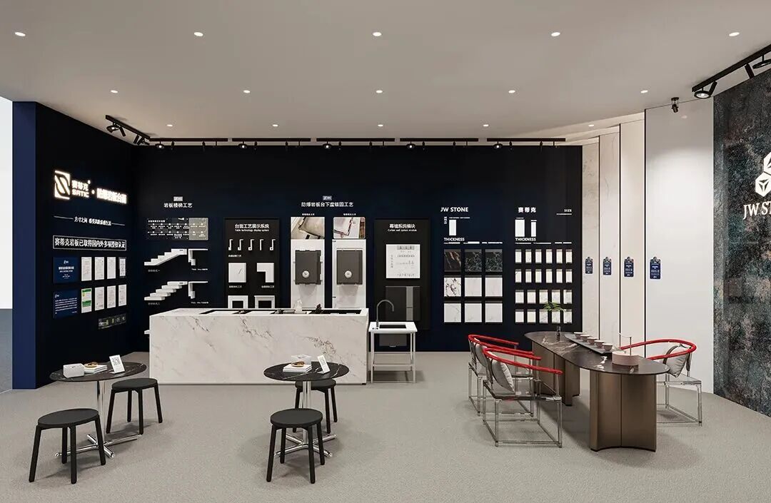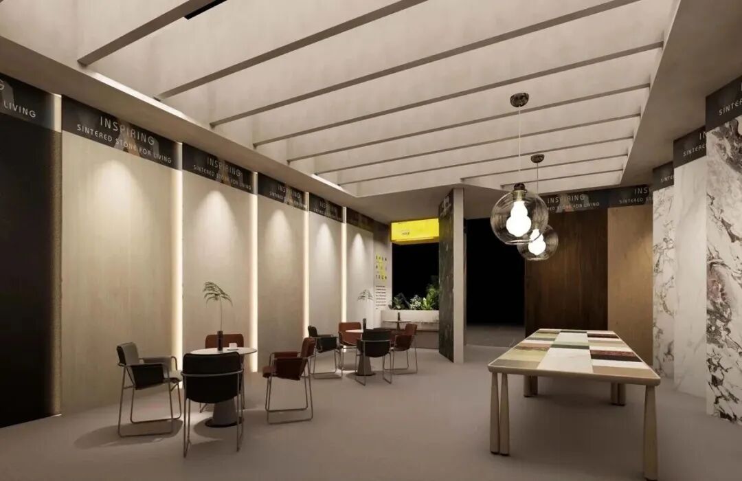 从策展逻辑来看,新岩素构建了循序渐进的四重体验:入口处的“艺术画廊”通过策展手法营造仪式感;核心区的“大板展区”以1600×3200㎜规格大板构筑功能分区,强调大尺寸的视觉统治力;而在中央洽谈区,岩板被定制为长桌、壁炉乃至情绪板,让商务洽谈沉浸于材质细节之中。