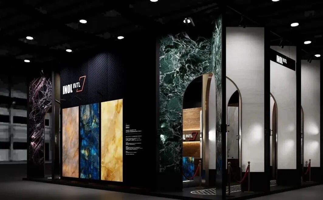 依诺岩板今年的关键词是“溯源”与“超越”。展位设计以自然矿山肌理为原点,通过模块化几何切割展墙,模拟被精准剖开的“矿脉切片”。