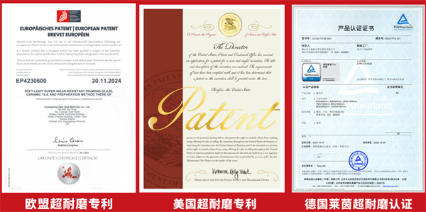 作为超耐磨瓷砖发明者,大角鹿持续聚焦超耐磨陶瓷新材料研发创新,自研超耐磨钻石釉国家发明专利技术体系,已完成四轮迭代,最新一代产品达到6000转极限耐磨水平,领先行业3-5年。大角鹿拥有行业超7成超耐磨国家发明专利,专利布局已覆盖中国、美国及欧盟,并成为首个通过德国莱茵超耐磨认证的中国瓷砖品牌,形成统一且可被国际市场理解、验证的技术标准。