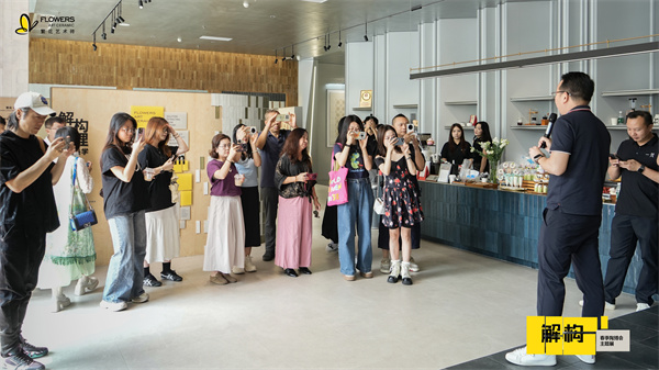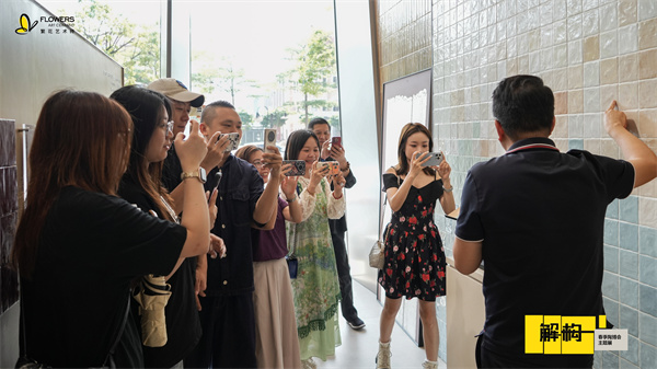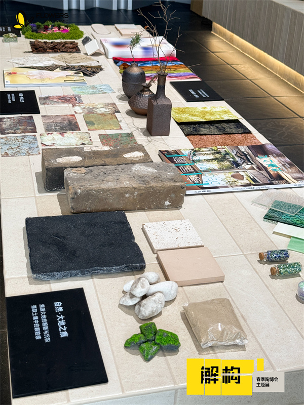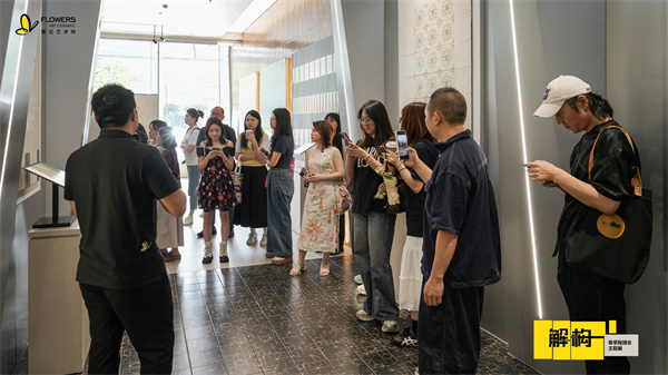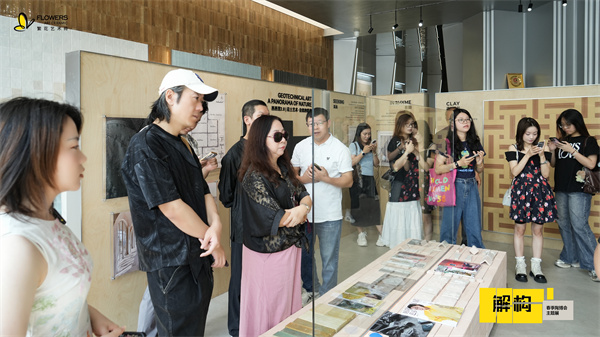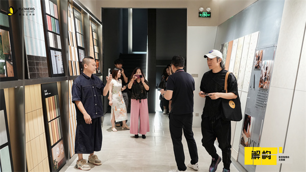随后,「繁花艺术砖市场部总监-黎伟华」带领媒体解说展览动线,从前厅LOGO墙的艺术肌理表达,到中央灵感溯源展台的自然素材呈现,再到画廊式展区的设计逻辑拆解,系统阐释“拆解—重组—新生”的策展内核,传递品牌对材质本真、设计溯源与生活美学的极致追求。