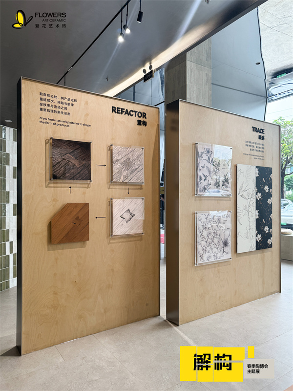 本次繁花艺术砖对展厅一楼、二楼进行全面焕新升级,以「解・构」为核心主题,打造集展览、体验、解读于一体的沉浸式艺术空间。摒弃单一产品陈列,以“脉络、剥离、痕迹、重构、转译、在场”六大板块构建完整叙事动线,将自然灵感、设计手稿、工艺样本、肌理细节与空间应用完整呈现,从“看产品”进阶为“读懂设计、感知工艺、体验美学”,直观感受艺术砖从自然元素到空间美学的完整转化路径。