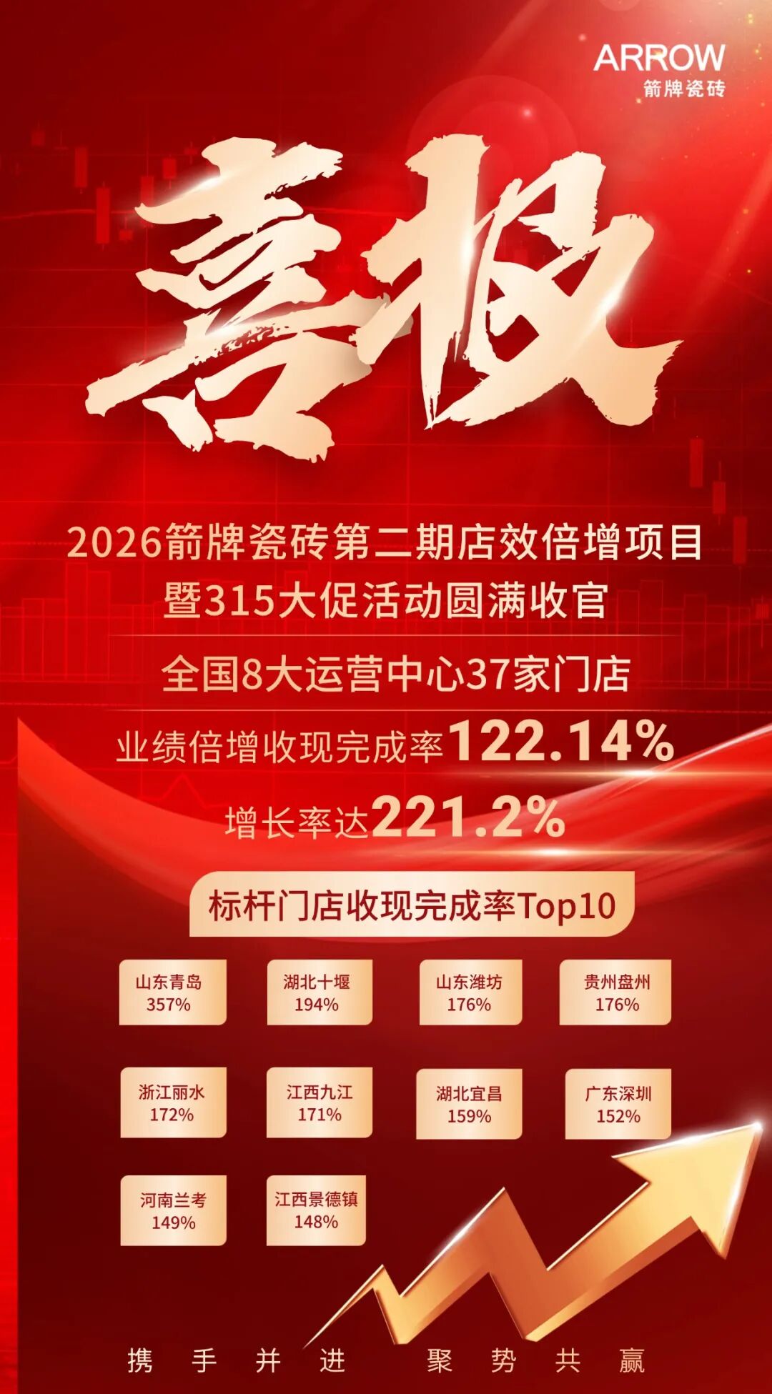 春潮涌动,再创佳绩!2026箭牌瓷砖第二期店效倍增项目暨315大促活动已圆满收官。本次活动中,全国8大运营中心37家门店同心协作、全力以赴,最终业绩倍增收现完成率达122.14%,收现业绩同比增长 221.2%,交出了一份亮眼答卷!