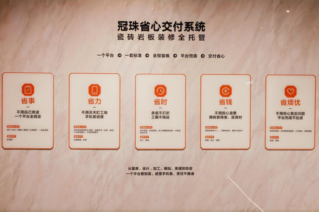 其中,“省心交付系统”为冠珠最新推出的面向高端零售市场的交付服务体系。新体系旨在破解瓷砖铺贴“落地难、交付乱”的痛点。其核心模式是“一个平台、一套标准、全流程托管”,系统全面覆盖量房、设计、加工、铺贴、美缝、验收等所有环节,用标准化流程取代手工施工的随意性,并以“效果不达标,平台来兜底”为终极承诺,标志着其交付体系进入了以用户最终体验为导向的2.0阶段。